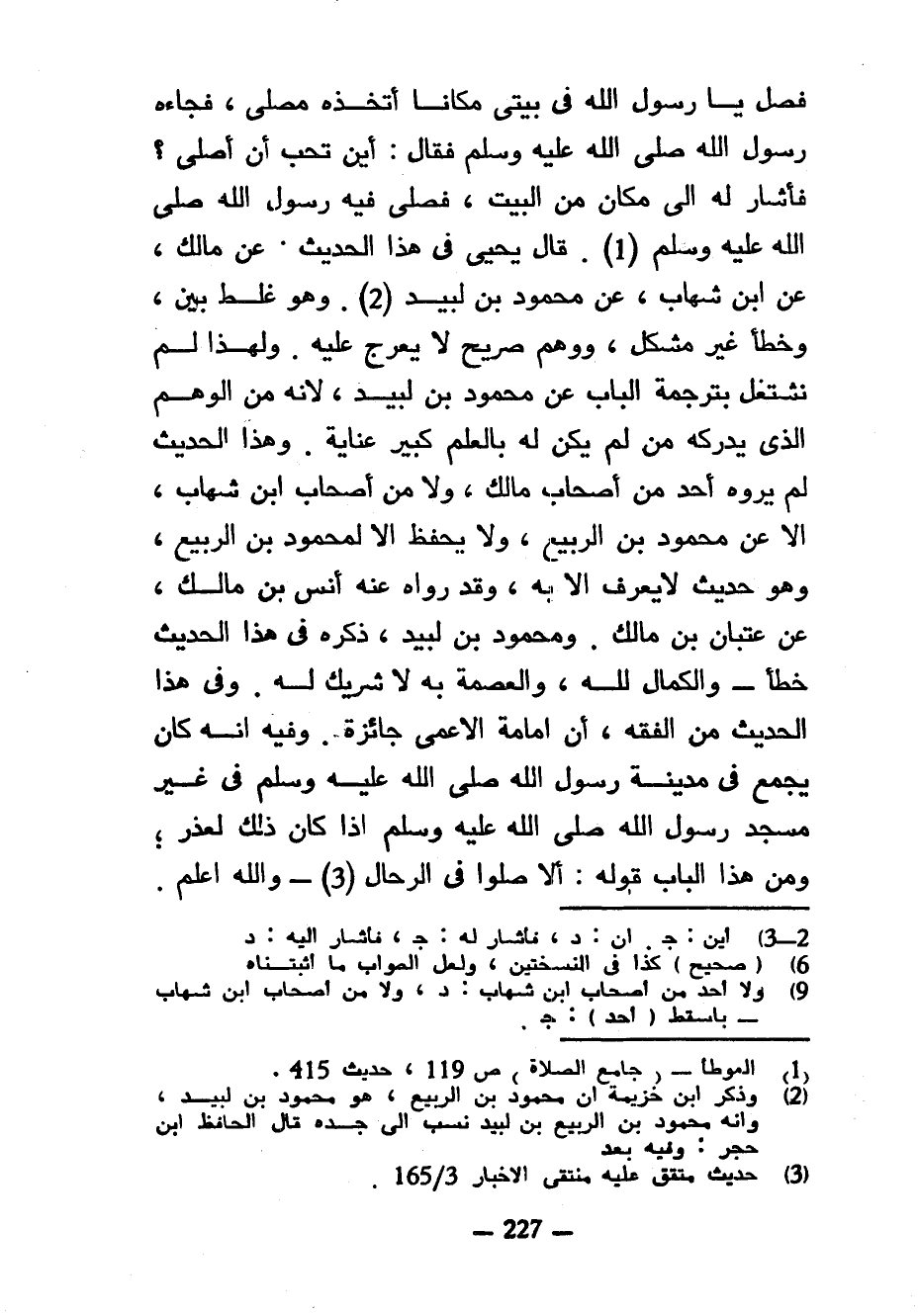 فَصَلِّ يَا رَسُولَ اللَّهِ فِي بَيْتِي مَكَانًا أَتَّخِذُهُ مُصَلًّى فَجَاءَهُ رَسُولُ اللَّهِ صَلَّى اللَّهُ عَلَيْهِ وَسَلَّمَ فَقَالَ أَيْنَ تُحِبُّ أَنْ أُصَلِّيَ فَأَشَارَ لَهُ إِلَى مَكَانٍ مِنَ الْبَيْتِ فَصَلَّى فِيهِ رَسُولُ اللَّهِ صَلَّى اللَّهُ عَلَيْهِ وَسَلَّمَ قَالَ يَحْيَى فِي هَذَا الْحَدِيثِ عَنْ مَالِكٍ عَنِ ابْنِ شِهَابٍ عَنْ مَحْمُودِ بْنِ لَبِيدٍ وَهُوَ غَلَطٌ بَيِّنٌ وَخَطَأٌ غَيْرُ مُشْكِلٍ وَوَهْمٌ صَرِيحٌ لَا يُعَرَّجُ عَلَيْهِ وَلِهَذَا لَمْ نَشْتَغِلْ بِتَرْجَمَةِ الْبَابِ عَنْ مَحْمُودِ بْنِ لَبِيدٍ لِأَنَّهُ مِنَ الْوَهْمِ الَّذِي يُدْرِكُهُ مَنْ لَمْ يَكُنْ لَهُ بِالْعِلْمِ كَبِيرُ عِنَايَةٍ وَهَذَا الْحَدِيثُ لَمْ يَرْوِهِ أَحَدٌ مِنْ أَصْحَابِ مَالِكٍ وَلَا مِنْ أَصْحَابِ ابْنِ شِهَابٍ إِلَّا عَنْ مَحْمُودِ بْنِ الرَّبِيعِ وَلَا يُحْفَظُ إِلَّا لِمَحْمُودِ بْنِ الرَّبِيعِ وَهُوَ حَدِيثٌ لَا يُعْرَفُ إِلَّا بِهِ وَقَدْ رَوَاهُ عَنْهُ أَنَسُ بْنُ مَالِكٍ عَنْ عِتْبَانَ بْنِ مَالِكٍ وَمَحْمُودُ بْنُ لَبِيدٍ ذِكْرُهُ فِي هَذَا الْحَدِيثِ خَطَأٌ وَالْكَمَالُ لِلَّهِ وَالْعِصْمَةُ بِهِ لَا شَرِيكَ لَهُ وَفِي هَذَا الْحَدِيثِ مِنَ الْفِقْهِ أَنَّ إِمَامَةَ الْأَعْمَى جَائِزَةٌ وَفِيهِ أَنَّهُ كَانَ يُجَمَّعُ فِي مَدِينَةِ رَسُولِ اللَّهِ صَلَّى اللَّهُ عَلَيْهِ وَسَلَّمَ فِي غَيْرِ مَسْجِدِ رَسُولِ اللَّهِ صَلَّى اللَّهُ عَلَيْهِ وَسَلَّمَ إِذَا كَانَ ذَلِكَ لِعُذْرٍ وَمِنْ هَذَا الْبَابِ قَوْلُهُ أَلَا صَلُّوا فِي الرِّحَالِ وَاللَّهُ أَعْلَمُ