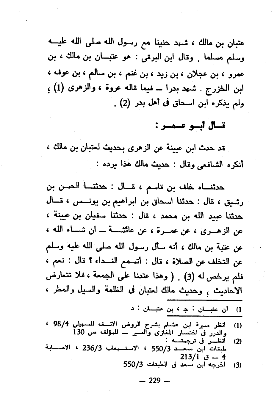 عِتْبَانَ بْنَ مَالِكٍ شَهِدَ حُنَيْنًا مَعَ رَسُولِ اللَّهِ صَلَّى اللَّهُ عَلَيْهِ وَسَلَّمَ مُسْلِمًا وَقَالَ ابْنُ الْبَرْقِيِّ هُوَ عِتْبَانُ بْنُ مَالِكِ بْنِ عَمْرِو بْنِ عِجْلَانَ بْنِ زَيْدِ بْنِ غَنْمِ بْنِ سَالِمِ بْنِ عَوْفِ بْنِ الْخَزْرَجِ شَهِدَ بَدْرًا فِيمَا قَالَهُ عُرْوَةُ وَالزُّهْرِيُّ وَلَمْ يَذْكُرْهُ ابْنُ إِسْحَاقَ فِي أَهْلِ بَدْرٍ قَالَ أَبُو عُمَرَ قَدْ حَدَّثَ ابْنُ عُيَيْنَةَ عَنِ الزُّهْرِيِّ بِحَدِيثٍ لَعِتْبَانَ بْنِ مَالِكٍ أَنْكَرَهُ الشَّافِعِيُّ وَقَالَ حدث مَالِكٍ هَذَا يَرُدُّهُ حَدَّثَنَا خَلَفُ بْنُ قَاسِمٍ قَالَ حَدَّثَنَا الْحَسَنُ بْنُ رَشِيقٍ قَالَ حَدَّثَنَا إِسْحَاقُ بْنُ إِبْرَاهِيمَ بْنِ يُونُسَ قَالَ حَدَّثَنَا عُبَيْدُ اللَّهِ بْنُ مُحَمَّدٍ قَالَ حَدَّثَنَا سُفْيَانُ بْنُ عُيَيْنَةَ عَنِ الزُّهْرِيِّ عَنْ عَمْرَةَ عَنْ عَائِشَةَ إِنْ شَاءَ اللَّهُ عَنْ عُتْبَةَ بْنِ مَالِكٍ أَنَّهُ سَأَلَ رَسُولَ اللَّهِ صَلَّى اللَّهُ عَلَيْهِ وَسَلَّمَ عَنِ التَّخَلُّفِ عَنِ الصَّلَاةِ قَالَ أَتَسْمَعُ النِّدَاءَ قَالَ نَعَمْ فَلَمْ يُرَخِّصْ لَهُ (وَهَذَا عِنْدَنَا عَلَى الْجُمُعَةِ فَلَا تَتَعَارَضُ الْأَحَادِيثُ وَحَدِيثُ مَالِكٍ لِعِتْبَانَ فِي الظُّلْمَةِ وَالسَّيْلِ وَالْمَطَرِ