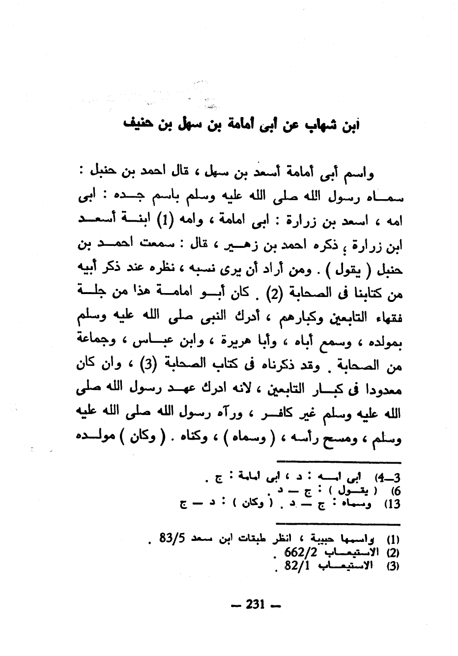 ابْنِ شِهَابٍ عَنْ أَبِي أُمَامَةَ بْنِ سَهْلِ بْنِ حُنَيْفٍ وَاسْمُ أَبِي أُمَامَةَ أَسْعَدُ بْنُ سَهْلٍ قَالَ أَحْمَدُ بْنُ حَنْبَلٍ سَمَّاهُ رَسُولُ اللَّهِ صَلَّى اللَّهُ عَلَيْهِ وَسَلَّمَ بِاسْمِ جَدِّهِ أَبِي أُمِّهِ أَسْعَدَ بْنِ زُرَارَةَ أَبِي أُمَامَةَ وَأُمُّهُ ابْنَةُ أَسْعَدَ بْنِ زُرَارَةَ ذَكَرُهُ أَحْمَدُ بن زهير قال سمعت أحمد بن حنيل (يَقُولُ) وَمَنْ أَرَادَ أَنْ يَرَى نَسَبَهُ نَظَرَهُ عِنْدَ ذِكْرِ أَبِيهِ مِنْ كِتَابِنَا فِي الصَّحَابَةِ كَانَ أَبُو أُمَامَةَ هَذَا مِنْ جِلَّةِ فُقَهَاءِ التَّابِعِينَ وَكِبَارِهِمْ أَدْرَكَ النَّبِيَّ صَلَّى اللَّهُ عَلَيْهِ وَسَلَّمَ بِمَوْلِدِهِ وَسَمِعَ أَبَاهُ وَأَبَا هُرَيْرَةَ وَابْنَ عَبَّاسٍ وَجَمَاعَةً مِنَ الصَّحَابَةِ وَقَدْ ذَكَرْنَاهُ فِي كِتَابِ الصَّحَابَةِ وَإِنْ كَانَ مَعْدُودًا فِي كِبَارِ التَّابِعِينَ لِأَنَّهُ أَدْرَكَ عَهْدِ رَسُولِ اللَّهِ صَلَّى اللَّهُ عَلَيْهِ وَسَلَّمَ وَمَسَحَ رَأَسَهُ (وَسَمَّاهُ) وَكَنَّاهُ (وكان) مولده