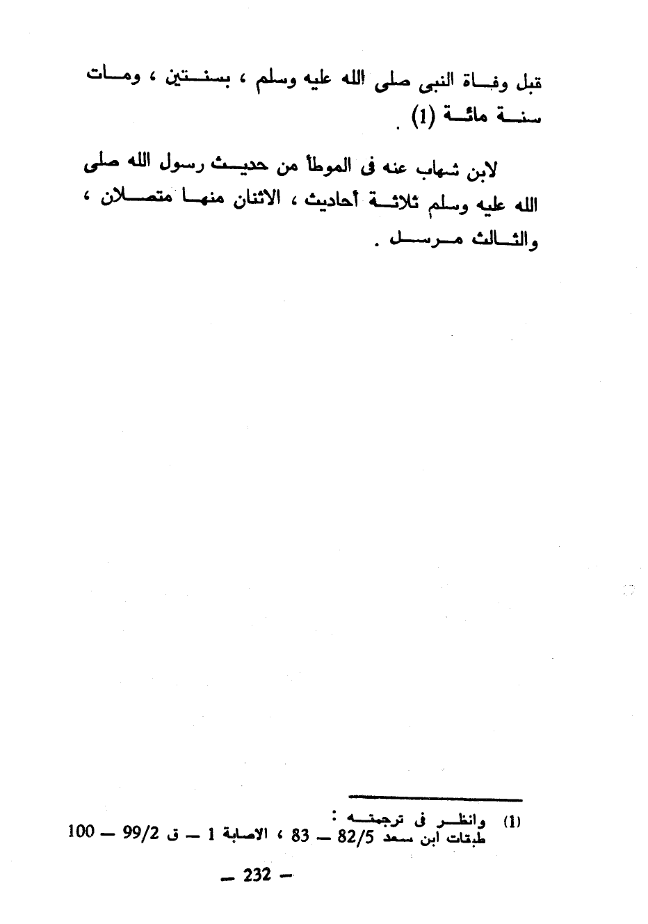 قَبْلَ وَفَاةِ النَّبِيِّ صَلَّى اللَّهُ عَلَيْهِ وَسَلَّمَ بِسَنَتَيْنِ وَمَاتَ سَنَةَ مِائَةٍ لِابْنِ شِهَابٍ عَنْهُ فِي الْمُوَطَّأِ مِنْ حَدِيثِ رَسُولِ اللَّهِ صَلَّى اللَّهُ عَلَيْهِ وَسَلَّمَ ثَلَاثَةُ أَحَادِيثَ الِاثْنَانِ مِنْهَا مُتَّصِلَانِ وَالثَّالِثُ مُرْسَلٌ