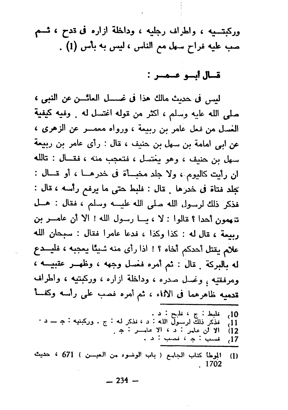 وَرُكْبَتَيْهِ وَأَطْرَافَ رِجْلَيْهِ وَدَاخِلَةَ إِزَارِهِ فِي قَدَحٍ ثُمَّ صُبَّ عَلَيْهِ فَرَاحَ سَهْلٌ مَعَ النَّاسِ لَيْسَ بِهِ بَأْسٌ قَالَ أَبُو عُمَرَ لَيْسَ فِي حَدِيثِ مَالِكٍ هَذَا فِي غُسْلِ الْعَائِنِ عَنِ النَّبِيِّ صَلَّى اللَّهُ عَلَيْهِ وَسَلَّمَ أَكْثَرَ مِنْ قَوْلِهِ اغْتَسِلْ لَهُ وَفِيهِ كَيْفِيَّةُ الْغُسْلِ مِنْ فِعْلِ عَامِرِ بْنِ رَبِيعَةَ وَرَوَاهُ مَعْمَرٌ عَنِ الزُّهْرِيِّ عَنْ أَبِي أُمَامَةَ بْنِ سَهْلِ بْنِ حُنَيْفٍ قَالَ رَأَى عَامِرُ بْنُ رَبِيعَةَ سَهْلَ بْنَ حُنَيْفٍ وَهُوَ يَغْتَسِلُ فَتَعَجَّبَ مِنْهُ فَقَالَ تَاللَّهِ إِنْ رَأَيْتُ كَالْيَوْمِ وَلَا جِلْدَ مُخَبَّأَةٍ فِي خِدْرِهَا أَوْ قَالَ جِلْدَ فَتَاةٍ فِي خِدْرِهَا قَالَ فَلُبِطَ حَتَّى مَا يَرْفَعُ رَأْسَهُ قَالَ فَذُكِرَ ذَلِكَ لِرَسُولِ اللَّهِ صَلَّى اللَّهُ عَلَيْهِ وَسَلَّمَ فَقَالَ هَلْ تَتَّهِمُونَ أَحَدًا قَالُوا لَا يَا رَسُولَ اللَّهِ إِلَّا أَنَّ عَامِرَ بْنَ رَبِيعَةَ قَالَ لَهُ كَذَا وَكَذَا فَدَعَا عَامِرًا فَقَالَ سُبْحَانَ اللَّهِ عَلَامَ يَقْتُلُ أَحَدُكُمْ أَخَاهُ إِذَا رَأَى مِنْهُ شَيْئًا يُعْجِبُهُ فَلْيَدْعُ لَهُ بِالْبَرَكَةِ قَالَ ثُمَّ أَمَرَهُ فَغَسَلَ وَجْهَهُ وَظَهْرَ عَقِبَيْهِ وَمِرْفَقَيْهِ وَغَسَلَ صَدْرَهُ وَدَاخِلَةَ إِزَارِهِ وَرُكْبَتَيْهِ وَأَطْرَافَ قَدَمَيْهِ ظَاهِرَهُمَا فِي الْإِنَاءِ ثُمَّ أَمَرَهُ فَصَبَّ عَلَى رَأْسِهِ وَكَفَأَ