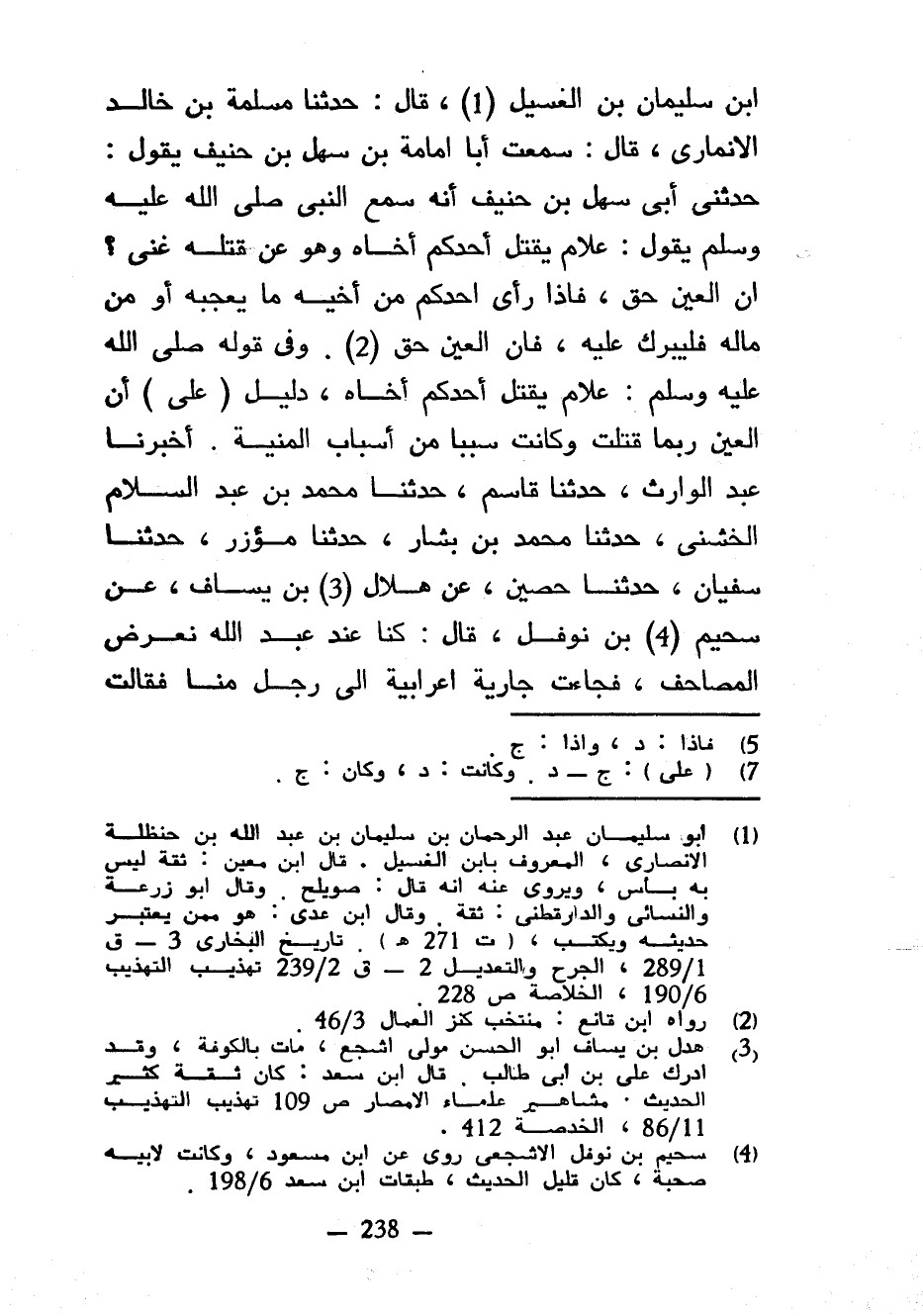 ابن سُلَيْمَانَ بْنِ الْغَسِيلِ قَالَ حَدَّثَنَا مَسْلَمَةُ بْنُ خَالِدٍ الْأَنْمَارِيُّ قَالَ سَمِعْتُ أَبَا أُمَامَةَ بْنَ سَهْلِ بْنِ حُنَيْفٍ يَقُولُ حَدَّثَنِي أَبِي سَهْلُ بْنُ حُنَيْفٍ أَنَّهُ سَمِعَ النَّبِيَّ صَلَّى اللَّهُ عَلَيْهِ وَسَلَّمَ يَقُولُ عَلَامَ يَقْتُلُ أَحَدُكُمْ أَخَاهُ وَهُوَ عَنْ قَتْلِهِ غَنِيٌّ إِنَّ الْعَيْنَ حَقٌّ فَإِذَا رَأَى أَحَدُكُمْ مِنْ أَخِيهِ مَا يُعْجِبُهُ أَوْ مِنْ مَالِهِ فَلْيُبَرِّكْ عَلَيْهِ فَإِنَّ الْعَيْنَ حَقٌّ وَفِي قَوْلِهِ صَلَّى اللَّهُ عَلَيْهِ وَسَلَّمَ عَلَامَ يَقْتُلُ أَحَدُكُمْ أَخَاهُ دَلِيلٌ (عَلَى) أَنَّ الْعَيْنَ رُبَّمَا قَتَلَتْ وَكَانَتْ سَبَبًا مِنْ أَسْبَابِ الْمَنِيَّةِ أَخْبَرَنَا عَبْدُ الْوَارِثِ حَدَّثَنَا قَاسِمٌ حَدَّثَنَا مُحَمَّدُ بْنُ عَبْدِ السَّلَامِ الْخُشَنِيُّ حَدَّثَنَا مُحَمَّدُ بْنُ بَشَّارٍ حَدَّثَنَا مُؤَزَّرٌ حَدَّثَنَا سُفْيَانُ حَدَّثَنَا حُصَيْنٌ عَنْ هِلَالِ بْنِ يَسَافٍ عَنْ سُحَيْمِ بن نوفل قال كنا عن عَبْدِ اللَّهِ نَعْرِضُ الْمَصَاحِفَ فَجَاءَتْ جَارِيَةٌ أَعْرَابِيَّةٌ إِلَى رَجُلٍ مِنَّا فَقَالَتْ