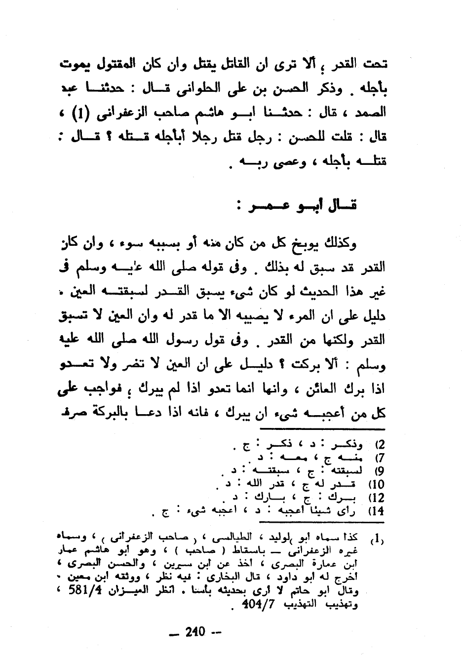 تَحَتَ الْقَدَرِ أَلَا تَرَى أَنَّ الْقَاتِلَ يُقْتَلُ وَإِنْ كَانَ الْمَقْتُولُ يَمُوتُ بِأَجَلِهِ وَذَكَرَ الْحَسَنُ بْنُ عَلِيٍّ الْحُلْوَانِيُّ قَالَ حَدَّثَنَا عَبْدُ الصَّمَدِ قَالَ حَدَّثَنَا أَبُو هَاشِمٍ صَاحِبُ الزَّعْفَرَانِيِّ قَالَ قُلْتُ لِلْحَسَنِ رَجُلٌ قَتَلَ رَجُلًا أَبِأَجَلِهِ قَتَلَهُ قَالَ قَتَلَهُ بِأَجَلِهِ وَعَصَى رَبَّهُ قَالَ أَبُو عُمَرَ وَكَذَلِكَ يُوَبَّخُ كُلُّ مَنْ كَانَ مِنْهُ أَوْ بِسَبَبِهِ سُوءٌ وَإِنْ كَانَ الْقَدَرُ قَدْ سَبَقَ لَهُ بِذَلِكَ وَفِي قَوْلِهِ صَلَّى اللَّهُ عَلَيْهِ وَسَلَّمَ فِي غَيْرِ هَذَا الْحَدِيثِ لَوْ كَانَ شَيْءٌ يَسْبِقُ الْقَدَرَ لَسَبَقَتْهُ الْعَيْنُ دَلِيلٌ عَلَى أَنَّ الْمَرْءَ لَا يُصِيبُهُ إِلَّا مَا قُدِّرَ لَهُ وَأَنَّ الْعَيْنَ لَا تَسْبِقُ الْقَدَرَ وَلَكِنَّهَا مِنَ الْقَدَرِ وَفِي قَوْلِ رَسُولِ اللَّهِ صَلَّى اللَّهُ عَلَيْهِ وَسَلَّمَ أَلَا بَرَّكْتَ دَلِيلٌ عَلَى أَنَّ الْعَيْنَ لَا تَضُرُّ وَلَا تَعْدُو إِذَا بَرَّكَ الْعَائِنُ وَأَنَّهَا إِنَّمَا تَعْدُو إِذَا لَمْ يُبَرِّكْ فَوَاجِبٌ عَلَى كُلِّ مَنْ أَعْجَبَهُ شَيْءٌ أَنْ يُبَرِّكَ فَإِنَّهُ إِذَا دَعَا بِالْبَرَكَةِ صرف