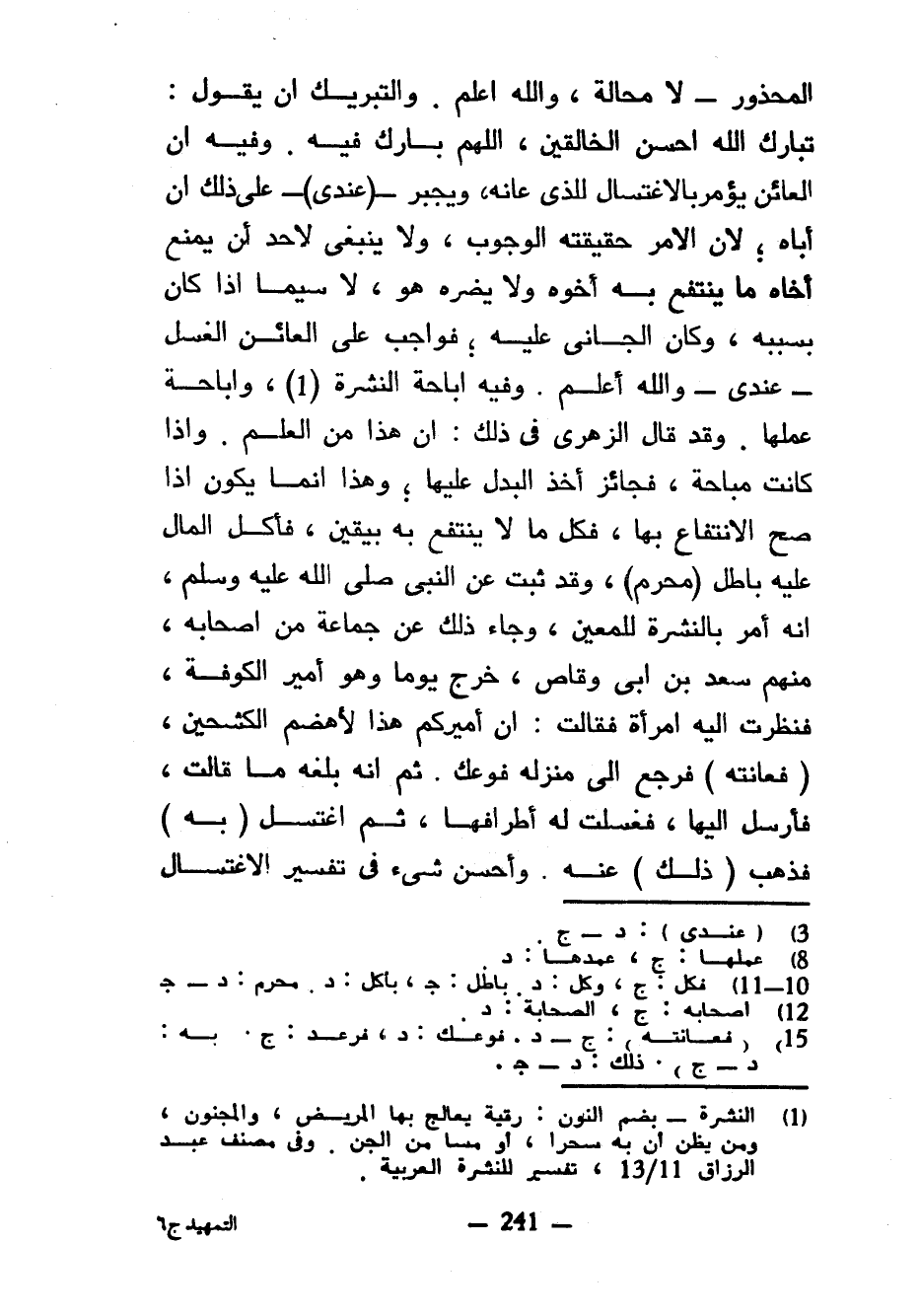 الْمَحْذُورُ لَا مَحَالَةَ وَاللَّهُ أَعْلَمُ وَالتَّبْرِيكُ أَنْ يَقُولَ تَبَارَكَ اللَّهُ أَحْسَنُ الْخَالِقِينَ اللَّهُمَّ بَارِكْ فيه وفيه أن العائن يؤمر بالاغتسال الذي عَانَهُ وَيُجْبَرُ (عِنْدِي) عَلَى ذَلِكَ إِنْ أَبَاهُ لِأَنَّ الْأَمْرَ حَقِيقَتُهُ الْوُجُوبُ وَلَا يَنْبَغِي لِأَحَدٍ أن يمنع أخاه ما ينتفع به أخوه وَلَا يَضُرُّهُ هُوَ لَا سِيَّمَا إِذَا كَانَ بِسَبَبِهِ وَكَانَ الْجَانِي عَلَيْهِ فَوَاجِبٌ عَلَى الْعَائِنِ الْغُسْلُ عِنْدِي وَاللَّهُ أَعْلَمُ وَفِيهِ إِبَاحَةُ النُّشْرَةِ وَإِبَاحَةُ عَمَلِهَا وَقَدْ قَالَ الزُّهْرِيُّ فِي ذَلِكَ إِنَّ هَذَا مِنَ الْعِلْمِ وَإِذَا كَانَتْ مُبَاحَةً فَجَائِزٌ أَخْذُ الْبَدَلِ عَلَيْهَا وَهَذَا إِنَّمَا يَكُونُ إِذَا صَحَّ الِانْتِفَاعُ بِهَا فَكُلُّ مَا لَا يُنْتَفَعُ بِهِ بِيَقِينٍ فَأَكْلُ الْمَالِ عَلَيْهِ بَاطِلٌ (مُحَرَّمٌ) وَقَدْ ثَبَتَ عَنِ النَّبِيِّ صَلَّى اللَّهُ عَلَيْهِ وَسَلَّمَ أَنَّهُ أَمَرَ بِالنُّشْرَةِ لِلْمَعِينِ وَجَاءَ ذَلِكَ عَنْ جَمَاعَةٍ مِنْ أَصْحَابِهِ مِنْهُمْ سَعْدُ بْنُ أَبِي وَقَّاصٍ خَرَجَ يَوْمًا وَهُوَ أَمِيرُ الْكُوفَةِ فَنَظَرَتْ إِلَيْهِ امْرَأَةٌ فَقَالَتْ إِنَّ أَمِيرَكُمْ هَذَا لَأَهْضَمَ الْكَشْحَيْنِ (فَعَانَتْهُ) فَرَجَعَ إِلَى مَنْزِلِهِ فَوُعِكَ ثُمَّ إِنَّهُ بَلَغَهُ مَا قَالَتْ فَأَرْسَلَ إِلَيْهَا فَغَسَلَتْ لَهُ أَطْرَافَهَا ثُمَّ اغْتَسَلَ (بِهِ) فَذَهَبَ (ذَلِكَ) عَنْهُ وَأَحْسَنُ شَيْءٍ فِي تَفْسِيرِ الاغتسال
