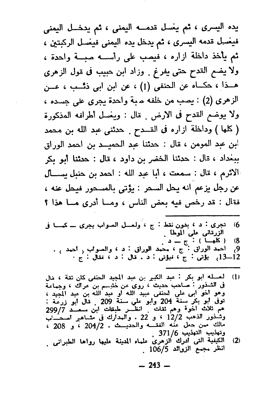 يَدِهِ الْيُسْرَى ثُمَّ يَغْسِلُ قَدَمَهُ الْيُمْنَى ثُمَّ يُدْخِلُ الْيُمْنَى فَيَغْسِلُ قَدَمَهُ الْيُسْرَى ثُمَّ يُدْخِلُ يَدَهُ الْيُمْنَى فَيَغْسِلُ الرُّكْبَتَيْنِ ثُمَّ يَأْخُذُ دَاخِلَةَ إِزَارِهِ فَيَصُبُّ عَلَى رَأْسِهِ صَبَّةً وَاحِدَةً وَلَا يَضَعُ الْقَدَحَ حَتَّى يَفْرُغَ وَزَادَ ابْنُ حَبِيبٍ فِي قَوْلِ الزُّهْرِيِّ هَذَا حَكَاهُ عَنِ الْحَنَفِيِّ عَنِ ابْنِ أَبِي ذِئْبٍ عَنِ الزُّهْرِيِّ يَصُبُّ مِنْ خَلْفِهِ صَبَّةً وَاحِدَةً يَجْرِي عَلَى جَسَدِهِ وَلَا يُوضَعُ الْقَدَحُ فِي الْأَرْضِ قَالَ وَيَغْسِلُ أَطْرَافَهُ الْمَذْكُورَةَ (كُلَّهَا) وَدَاخِلَةَ إِزَارِهِ فِي الْقَدَحِ حَدَّثَنِي عَبْدُ اللَّهِ بْنُ مُحَمَّدِ بْنِ عَبْدِ الْمُؤْمِنِ قَالَ حَدَّثَنَا عَبْدُ الْحَمِيدِ بْنُ أَحْمَدَ الْوَرَّاقُ بِبَغْدَادَ قَالَ حَدَّثَنَا الْخَضِرُ بْنُ دَاوُدَ قَالَ حَدَّثَنَا أَبُو بَكْرٍ الْأَثْرَمُ قَالَ سَمِعْتُ أَبَا عَبْدِ اللَّهِ أَحْمَدَ بْنَ حَنْبَلٍ يُسْأَلُ عَنْ رَجُلٍ يَزْعُمُ أَنَّهُ يَحُلُّ السِّحْرَ يُؤْتَى بِالْمَسْحُورِ فَيَحُلُّ عَنْهُ فَقَالَ قَدْ رَخَّصَ فِيهِ بَعْضُ النَّاسِ وَمَا أَدْرِي مَا هَذَا