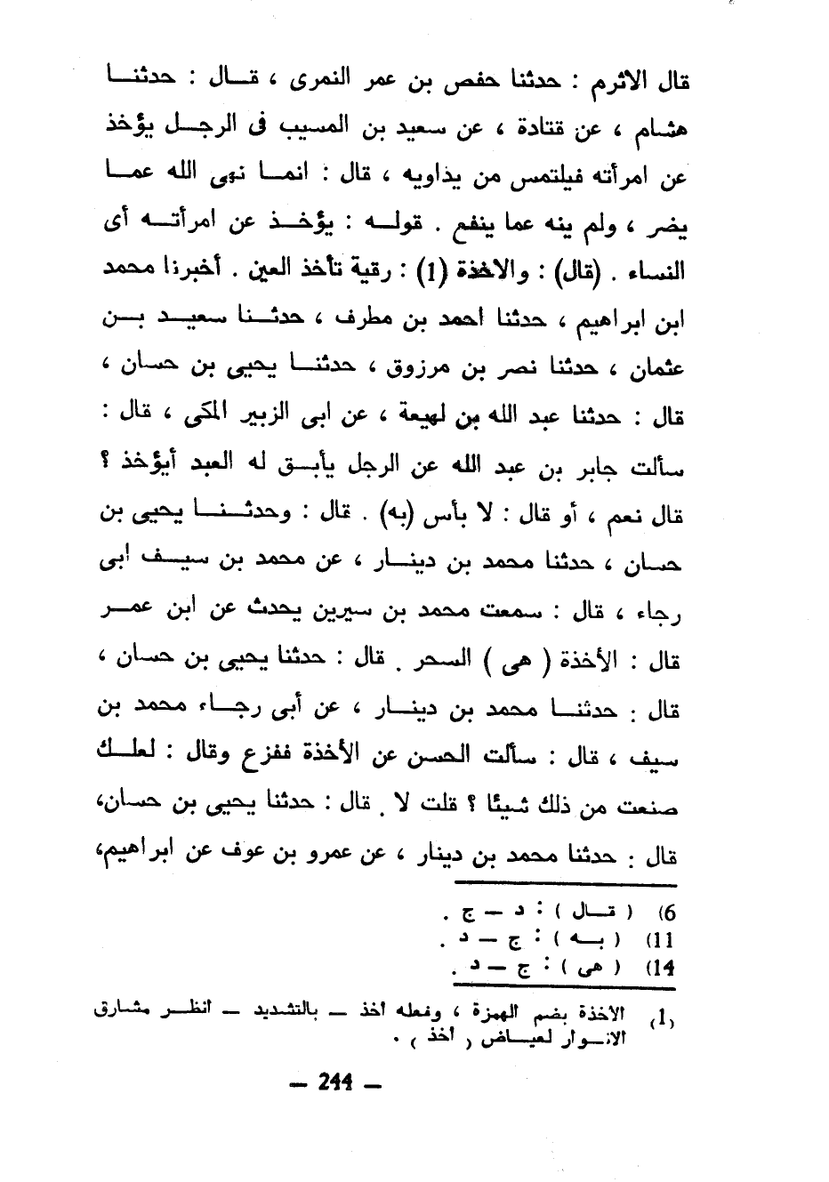 قَالَ الْأَثْرَمُ حَدَّثَنَا حَفْصُ بْنُ عُمَرَ النَّمَرِيُّ قَالَ حَدَّثَنَا هِشَامٌ عَنْ قَتَادَةَ عَنْ سَعِيدِ بْنِ الْمُسَيَّبِ فِي الرَّجُلِ يُؤْخَذُ عَنِ امْرَأَتِهِ فَيَلْتَمِسُ مَنْ يُدَاوِيهِ قَالَ إِنَّمَا نَهَى اللَّهُ عَمَّا يَضُرُّ وَلَمْ يَنْهَ عَمَّا يَنْفَعُ قَوْلُهُ يُؤْخَذُ عَنِ امْرَأَتِهِ أَيِ النِّسَاءِ (قَالَ) وَالْأُخْذَةُ رُقْيَةٌ تَأْخُذُ الْعَيْنَ أَخْبَرَنَا مُحَمَّدُ بْنُ إِبْرَاهِيمَ حَدَّثَنَا أَحْمَدُ بْنُ مُطَرِّفٍ حَدَّثَنَا سَعِيدُ بْنُ عُثْمَانَ حَدَّثَنَا نَصْرُ بْنُ مَرْزُوقٍ حَدَّثَنَا يَحْيَى بْنُ حَسَّانَ قَالَ حَدَّثَنَا عَبْدُ اللَّهِ بْنُ لَهِيعَةَ عَنْ أَبِي الزُّبَيْرِ الْمَكِّيِّ قَالَ سَأَلْتُ جَابِرَ بْنَ عَبْدِ اللَّهِ عَنِ الرَّجُلِ يَأْبَقُ لَهُ الْعَبْدُ أَيُؤْخَذُ قَالَ نَعَمْ أَوْ قَالَ لَا بَأْسَ (بِهِ) قَالَ وَحَدَّثَنَا يَحْيَى بْنُ حَسَّانَ حَدَّثَنَا مُحَمَّدُ بْنُ دِينَارٍ عَنْ مُحَمَّدِ بْنِ سَيْفٍ أَبِي رَجَاءٍ قَالَ سَمِعْتُ مُحَمَّدَ بْنَ سِيرِينَ يُحَدِّثُ عَنِ ابْنِ عُمَرَ قَالَ الْأُخْذَةُ (هِيَ) السِّحْرُ قَالَ حَدَّثَنَا يَحْيَى بْنُ حَسَّانَ قَالَ حَدَّثَنَا مُحَمَّدُ بْنُ دِينَارٍ عَنْ أَبِي رَجَاءٍ مُحَمَّدِ بْنِ سَيْفٍ قَالَ سَأَلْتُ الْحَسَنَ عَنِ الْأُخْذَةِ فَفَزِعَ وَقَالَ لَعَلَّكَ صَنَعْتَ مِنْ ذَلِكَ شَيْئًا قُلْتُ لَا قَالَ حَدَّثَنَا يَحْيَى بْنُ حَسَّانَ قَالَ حَدَّثَنَا مُحَمَّدُ بْنُ دِينَارٍ عَنْ عَمْرِو بْنِ عَوْفٍ عَنْ إِبْرَاهِيمَ