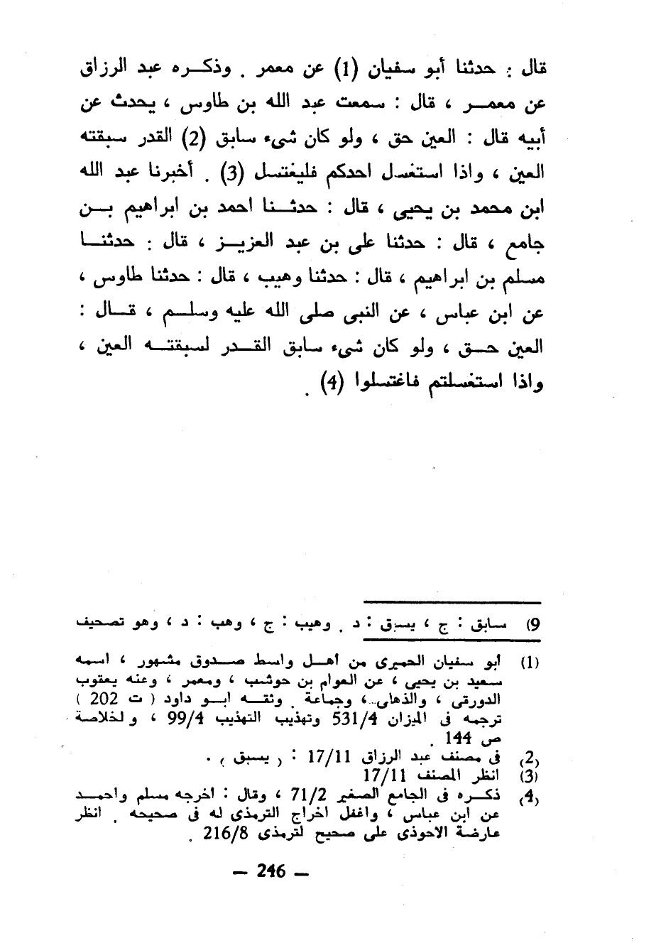 قَالَ حَدَّثَنَا أَبُو سُفْيَانَ عَنْ مَعْمَرٍ وَذَكَرَهُ عَبْدُ الرَّزَّاقِ عَنْ مَعْمَرٍ قَالَ سَمِعْتُ عَبْدَ اللَّهِ بْنَ طَاوُسٍ يُحَدِّثُ عَنْ أَبِيهِ قَالَ الْعَيْنُ حَقٌّ وَلَوْ كَانَ شَيْءٌ سَابِقَ الْقَدَرِ سَبَقَتْهُ الْعَيْنُ وَإِذَا اسْتُغْسِلَ أَحَدُكُمْ فَلْيَغْتَسِلْ أَخْبَرَنَا عَبْدُ اللَّهِ بْنُ مُحَمَّدِ بْنِ يَحْيَى قَالَ حَدَّثَنَا أَحْمَدُ بْنُ إِبْرَاهِيمَ بْنِ جَامِعٍ قَالَ حَدَّثَنَا عَلِيُّ بْنُ عَبْدِ الْعَزِيزِ قَالَ حَدَّثَنَا مُسْلِمُ بْنُ إِبْرَاهِيمَ قَالَ حَدَّثَنَا وُهَيْبٌ قَالَ حَدَّثَنَا طَاوُسٍ عَنِ ابْنِ عَبَّاسٍ عَنِ النَّبِيِّ صَلَّى اللَّهُ عَلَيْهِ وَسَلَّمَ قَالَ الْعَيْنُ حَقٌّ وَلَوْ كَانَ شَيْءٌ سَابِقَ الْقَدَرِ لَسَبَقَتْهُ الْعَيْنُ وَإِذَا اسْتُغْسِلْتُمْ فَاغْتَسِلُوا
