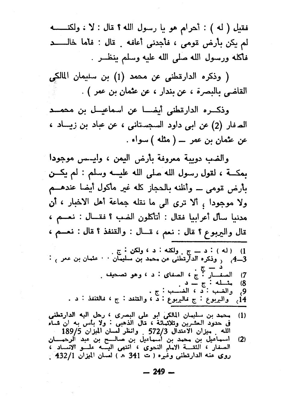 فَقِيلَ (لَهُ) أَحَرَامٌ هُوَ يَا رَسُولَ اللَّهِ قَالَ لَا وَلَكِنَّهُ لَمْ يَكُنْ بِأَرْضِ قَوْمِي فَأَجِدُنِي أَعَافُهُ قَالَ فَأَمَّا خَالِدٌ فَأَكَلَهُ وَرَسُولُ اللَّهِ صَلَّى اللَّهُ عَلَيْهِ وَسَلَّمَ يَنْظُرُ (وَذَكَرَهُ الدَّارَقُطْنِيُّ عَنْ مُحَمَّدِ (1) بْنِ سُلَيْمَانَ الْمَالِكِيِّ الْقَاضِي بِالْبَصْرَةِ عَنْ بُنْدَارٍ عَنْ عُثْمَانَ بْنِ عُمَرَ) وَذَكَرَهُ الدَّارَقُطْنِيُّ أَيْضًا عَنْ إِسْمَاعِيلَ بْنِ مُحَمَّدٍ الصَّفَّارِ عَنْ أَبِي دَاوُدَ السِّجِسْتَانِيِّ عَنْ عَبَّادِ بْنِ زِيَادٍ عَنْ عُثْمَانَ بْنِ عُمَرَ (مِثْلَهُ) سَوَاءً وَالضَّبُّ دُوَيْبَّةٌ مَعْرُوفَةٌ بِأَرْضِ الْيَمَنِ وَلَيْسَ مَوْجُودًا بِمَكَّةَ لِقَوْلِ رَسُولِ اللَّهِ صَلَّى اللَّهُ عَلَيْهِ وَسَلَّمَ لَمْ يَكُنْ بِأَرْضِ قَوْمِي وَأَظُنُّهُ بِالْحِجَازِ كُلِّهِ غَيْرَ مَأْكُولٍ أَيْضًا عِنْدَهُمْ وَلَا مَوْجُودًا أَلَا تَرَى إِلَى مَا نَقَلَهُ جَمَاعَةُ أَهْلِ الْأَخْبَارِ أَنَّ مَدَنِيًّا سَأَلَ أَعْرَابِيًّا فَقَالَ أَتَأْكُلُونَ الضَّبَّ فَقَالَ نَعَمْ قَالَ وَالْيَرْبُوعَ قَالَ نَعَمْ قَالَ وَالْقُنْفُذَ قَالَ نَعَمْ