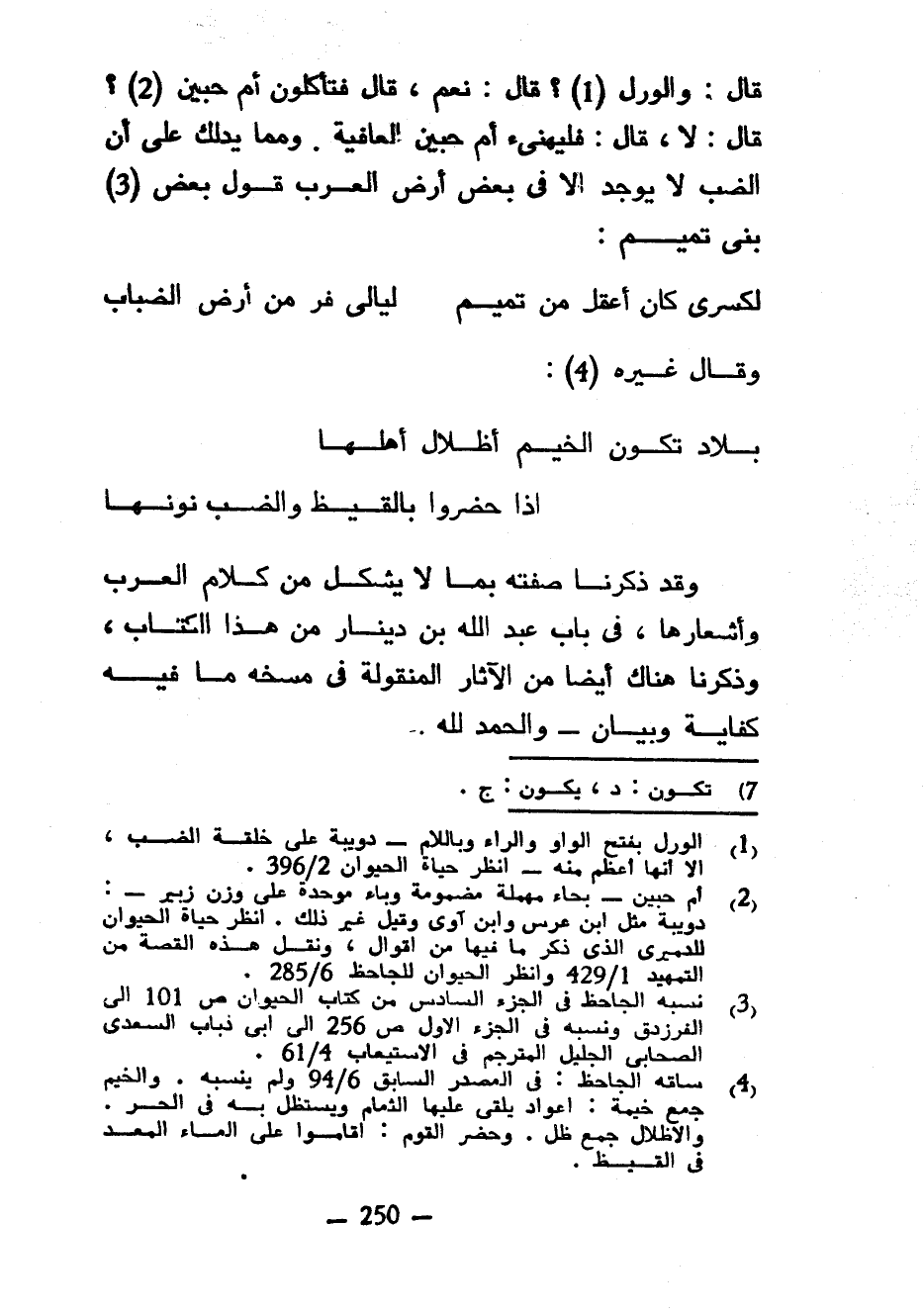 قَالَ وَالْوَرَلَ قَالَ نَعَمْ قَالَ فَتَأْكُلُونَ أُمَّ حبين قال لا قال فليهنىء أم جبين الْعَافِيَةُ وَمِمَّا يَدُلُّكَ عَلَى أَنَّ الضَّبَّ لَا يُوجَدُ إِلَّا فِي بَعْضِ أَرْضِ الْعَرَبِ قَوْلُ بَعْضِ بَنِي تَمِيمٍ ... لَكِسْرَى كَانَ أَعْقَلَ مِنْ تَمِيمٍ ... لَيَالِيَ فَرَّ مِنْ أَرْضِ الضِّبَابِ ... ... وَقَالَ غَيْرُهُ ... بِلَادٌ تَكُونُ الْخَيْمُ أَظْلَالَ أَهْلِهَا ... ... إِذَا حَضَرُوا بِالْقَيْظِ وَالضَّبُّ نُونُهَا ... ... وَقَدْ ذَكَرْنَا صِفَتَهُ بِمَا لَا يُشْكَلُ مِنْ كَلَامِ الْعَرَبِ وَأَشْعَارِهَا فِي بَابِ عَبْدِ اللَّهِ بْنِ دِينَارٍ مِنْ هَذَا الْكِتَابِ وَذَكَرْنَا هُنَاكَ أَيْضًا مِنَ الْآثَارِ الْمَنْقُولَةِ فِي مَسْخِهِ مَا فِيهِ كِفَايَةٌ وَبَيَانٌ والحمد لله