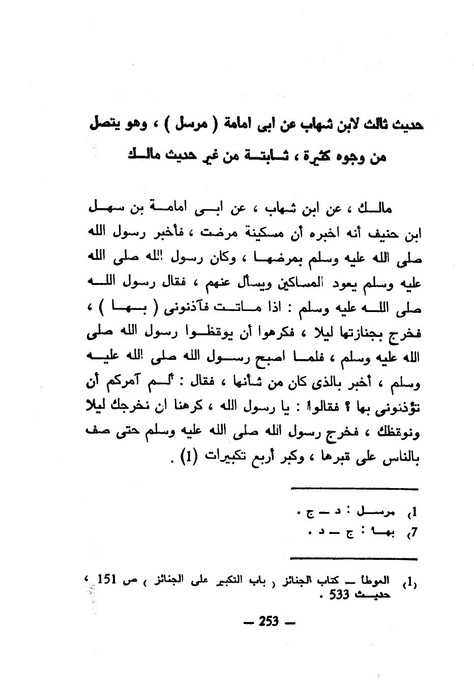 حَدِيثٌ ثَالِثٌ لِابْنِ شِهَابٍ عَنْ أَبِي أُمَامَةَ (مُرْسَلٌ) وَهُوَ يَتَّصِلُ مِنْ وُجُوهٍ كَثِيرَةٍ ثَابِتَةٍ مِنْ غَيْرِ حَدِيثِ مَالِكٍ مَالِكٌ عَنِ ابْنِ شِهَابٍ عَنْ أَبِي أُمَامَةَ بْنِ سَهْلِ بْنِ حُنَيْفٍ أَنَّهُ أَخْبَرَهُ أَنَّ مِسْكِينَةً مَرِضَتْ فَأَخْبَرَ رَسُولَ اللَّهِ صَلَّى اللَّهُ عَلَيْهِ وَسَلَّمَ بِمَرَضِهَا وَكَانَ رَسُولُ اللَّهِ صَلَّى اللَّهُ عَلَيْهِ وَسَلَّمَ يَعُودُ الْمَسَاكِينَ وَيَسْأَلُ عَنْهُمْ فَقَالَ رَسُولُ اللَّهِ صَلَّى اللَّهُ عَلَيْهِ وَسَلَّمَ إِذَا مَاتَتْ فَآذِنُونِي (بِهَا) فَخُرِجَ بِجِنَازَتِهَا لَيْلًا فَكَرِهُوا أَنْ يُوقِظُوا رَسُولُ اللَّهِ صَلَّى اللَّهُ عَلَيْهِ وَسَلَّمَ فَلَمَّا أَصْبَحَ رَسُولَ اللَّهِ صَلَّى اللَّهُ عَلَيْهِ وَسَلَّمَ أَخْبَرَ بِالَّذِي كَانَ مِنْ شَأْنِهَا فَقَالَ أَلَمْ آمُرْكُمْ أَنْ تُؤْذِنُونِي بِهَا فَقَالُوا يَا رَسُولَ اللَّهِ كَرِهْنَا أَنْ نُخْرِجَكَ لَيْلًا وَنُوقِظَكَ فَخَرَجَ رَسُولُ اللَّهِ صَلَّى اللَّهُ عَلَيْهِ وَسَلَّمَ حتى صَفَّ بِالنَّاسِ عَلَى قَبْرِهَا وَكَبَّرَ أَرْبَعَ تَكْبِيرَاتٍ