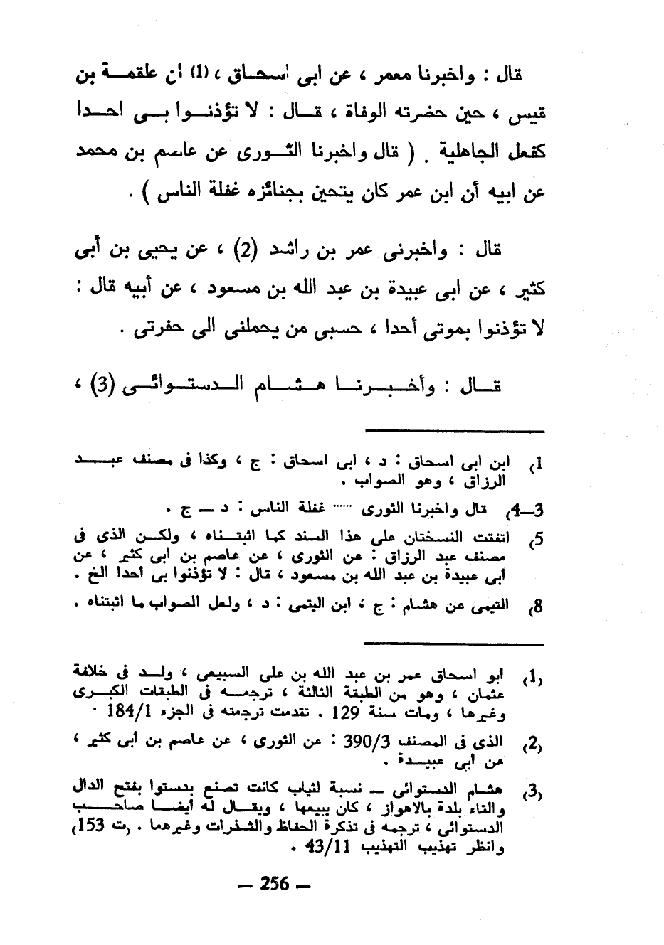 قَالَ وَأَخْبَرَنَا مَعْمَرٌ عَنْ أَبِي إِسْحَاقَ أَنَّ عَلْقَمَةَ بْنَ قَيْسٍ حِينَ حَضَرَتْهُ الْوَفَاةُ قَالَ لَا تُؤْذِنُوا بِي أَحَدًا كَفِعْلِ الْجَاهِلِيَّةِ (قَالَ وَأَخْبَرَنَا الثَّوْرِيُّ عَنْ عَاصِمِ بْنِ مُحَمَّدٍ عَنْ أَبِيهِ أَنَّ ابْنَ عُمَرَ كَانَ يَتَحَيَّنُ بِجَنَائِزِهِ غَفْلَةَ النَّاسِ) قَالَ وَأَخْبَرَنِي عُمَرُ بْنُ رَاشِدٍ عَنْ يَحْيَى بْنِ أَبِي كَثِيرٍ عَنْ أَبِي عُبَيْدَةَ بْنِ عَبْدِ اللَّهِ بْنِ مَسْعُودٍ عَنْ أَبِيهِ قَالَ لَا تُؤْذِنُوا بِمَوْتِي أَحَدًا حَسْبِي مَنْ يَحْمِلُنِي إِلَى حُفْرَتِي قَالَ وَأَخْبَرَنَا هِشَامٌ الدستوائي