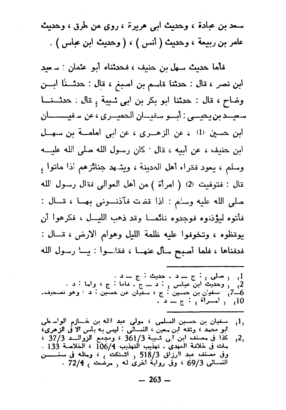 سَعْدِ بْنِ عُبَادَةَ وَحَدِيثُ أَبِي هُرَيْرَةَ رُوِيَ مِنْ طُرُقٍ وَحَدِيثُ عَامِرِ بْنِ رَبِيعَةَ وَحَدِيثُ (أَنَسٍ) (وَحَدِيثُ ابْنِ عَبَّاسٍ) فَأَمَّا حَدِيثُ سَهْلِ بْنِ حُنَيْفٍ فَحَدَّثَنَاهُ أَبُو عُثْمَانَ سَعِيدُ بْنُ نَصْرٍ قَالَ حَدَّثَنَا قَاسِمُ بْنُ أَصْبَغَ قَالَ حَدَّثَنَا ابْنُ وَضَّاحٍ قَالَ حَدَّثَنَا أَبُو بَكْرِ بْنُ أَبِي شَيْبَةَ قَالَ حَدَّثَنَا سعيد ابن يحيى أبو سفيان الحميري عن سفيان ابن حسين عن الزهري عن أبي أمامة ابن سَهْلِ بْنِ حُنَيْفٍ عَنْ أَبِيهِ قَالَ كَانَ رَسُولُ اللَّهِ صَلَّى اللَّهُ عَلَيْهِ وَسَلَّمَ يَعُودُ فُقَرَاءَ أَهْلِ الْمَدِينَةِ وَيَشْهَدُ جَنَائِزَهُمْ إِذَا مَاتُوا قَالَ فَتُوُفِّيَتِ (امْرَأَةٌ) مِنْ أَهْلِ الْعَوَالِي فَقَالَ رَسُولُ اللَّهِ صَلَّى اللَّهُ عَلَيْهِ وَسَلَّمَ إذا قَضَتْ فَآذِنُونِي بِهَا قَالَ فَأَتَوْهُ لِيُؤْذِنُوهُ فَوَجَدُوهُ نَائِمًا وَقَدْ ذَهَبَ اللَّيْلُ فَكَرِهُوا أَنْ يُوقِظُوهُ وَتَخَوَّفُوا عَلَيْهِ ظُلْمَةَ اللَّيْلِ وَهَوَامَّ الْأَرْضِ قَالَ فَدَفَنَّاهَا فَلَمَّا أَصْبَحَ سَأَلَ عَنْهَا فَقَالُوا يَا رسول الله