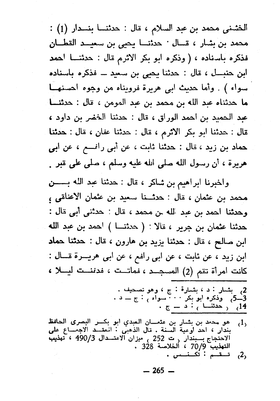 الْخُشَنِيُّ مُحَمَّدُ بْنُ عَبْدِ السَّلَامِ قَالَ حَدَّثَنَا بُنْدَارٌ مُحَمَّدُ بْنُ بَشَّارٍ قَالَ حَدَّثَنَا يَحْيَى بْنُ سَعِيدٍ الْقَطَّانُ فَذَكَرَهُ بِإِسْنَادِهِ (وَذَكَرَهُ أَبُو بكر الأثرم قال حدثناأحمد بْنُ حَنْبَلٍ قَالَ حَدَّثَنَا يَحْيَى بْنُ سَعِيدٍ فَذَكَرَهُ بِإِسْنَادِهِ سَوَاءً) وَأَمَّا حَدِيثُ أَبِي هُرَيْرَةَ فَرُوِّينَاهُ مِنْ وُجُوهٍ أَحْسَنُهَا مَا حَدَّثَنَاهُ عَبْدُ اللَّهِ بْنُ مُحَمَّدِ بْنِ عَبْدِ الْمُؤْمِنِ قَالَ حَدَّثَنَا عَبْدُ الْحَمِيدِ بْنُ أَحْمَدَ الْوَرَّاقُ قَالَ حَدَّثَنَا الْخَضِرُ بْنُ دَاوُدَ قَالَ حَدَّثَنَا أَبُو بَكْرٍ الْأَثْرَمُ قَالَ حَدَّثَنَا عَفَّانُ قَالَ حَدَّثَنَا حَمَّادُ بْنُ زَيْدٍ قَالَ حَدَّثَنَا ثَابِتٌ عَنْ أَبِي رَافِعٍ عَنْ أَبِي هُرَيْرَةَ أَنَّ رَسُولَ اللَّهِ صَلَّى اللَّهُ عَلَيْهِ وَسَلَّمَ صَلَّى عَلَى قَبْرٍ وَأَخْبَرَنَا إِبْرَاهِيمُ بْنُ شَاكِرٍ قَالَ حَدَّثَنَا عَبْدُ اللَّهِ بْنُ مُحَمَّدِ بْنِ عُثْمَانَ قَالَ حَدَّثَنَا سَعِيدُ بْنُ عُثْمَانَ الْأَعْنَاقِيُّ وَحَدَّثَنَا أَحْمَدُ بْنُ عَبْدِ اللَّهِ بْنِ مُحَمَّدٍ قَالَ حَدَّثَنِي أَبِي قَالَ حَدَّثَنَا عُثْمَانُ بْنُ جَرِيرٍ قَالَا (حَدَّثَنَا) أَحْمَدُ بْنُ عَبْدِ اللَّهِ بْنِ صَالِحٍ قَالَ حَدَّثَنَا يَزِيدُ بْنُ هَارُونَ قَالَ حَدَّثَنَا حَمَّادُ بْنُ زَيْدٍ عَنْ ثَابِتٍ عَنْ أَبِي رَافِعٍ عَنْ أَبِي هُرَيْرَةَ قَالَ كَانَتِ امْرَأَةٌ تَقُمُّ الْمَسْجِدَ فَمَاتَتْ فَدُفِنَتْ لَيْلًا