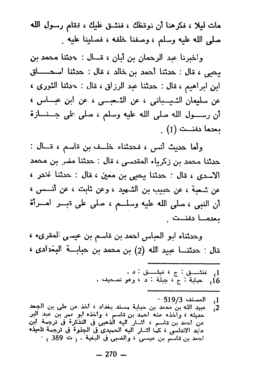 مات ليلا فكرهنا أن نوفظك فَنَشُقَّ عَلَيْكَ فَقَامَ رَسُولُ اللَّهِ صَلَّى اللَّهُ عَلَيْهِ وَسَلَّمَ وَصَفَّنَا خَلْفَهُ فَصَلَّيْنَا عَلَيْهِ وَأَخْبَرَنَا عَبْدُ الرَّحْمَنِ بْنُ أَبَانَ قَالَ حَدَّثَنَا مُحَمَّدُ بْنُ يَحْيَى قَالَ حَدَّثَنَا أَحْمَدُ بْنُ خَالِدٍ قَالَ حَدَّثَنَا إِسْحَاقُ بْنُ إِبْرَاهِيمَ قَالَ حَدَّثَنَا عَبْدُ الرَّزَّاقِ قَالَ حَدَّثَنَا الثَّوْرِيُّ عَنْ سُلَيْمَانَ الشَّيْبَانِيِّ عَنِ الشَّعْبِيِّ عَنِ ابْنِ عَبَّاسٍ أَنَّ رَسُولَ اللَّهِ صَلَّى اللَّهُ عَلَيْهِ وَسَلَّمَ صَلَّى عَلَى جِنَازَةٍ بَعْدَمَا دُفِنَتْ وَأَمَّا حَدِيثُ أَنَسٍ فَحَدَّثَنَاهُ خَلَفُ بْنُ قَاسِمٍ قَالَ حَدَّثَنَا مُحَمَّدُ بْنُ زَكَرِيَّاءَ الْمَقْدِسِيُّ قَالَ حَدَّثَنَا مُضَرُ بْنُ مُحَمَّدٍ الْأَسَدِيُّ قَالَ حَدَّثَنَا يَحْيَى بْنُ مَعِينٍ قَالَ حَدَّثَنَا غُنْدَرٌ عَنْ شُعْبَةَ عَنْ حَبِيبِ بْنِ الشَّهِيدِ وَعَنْ ثَابِتٍ عَنْ أَنَسٍ أَنَّ النَّبِيَّ صَلَّى اللَّهُ عَلَيْهِ وَسَلَّمَ صَلَّى عَلَى قَبْرِ امْرَأَةٍ بَعْدَمَا دُفِنَتْ وَحَدَّثَنَاهُ أَبُو الْعَبَّاسِ أحمد بن قاسم بن عيسى المقرىء قال حدثنا عبيد الله ابن مُحَمَّدِ بْنِ حُبَابَةَ الْبَغْدَادِيُّ