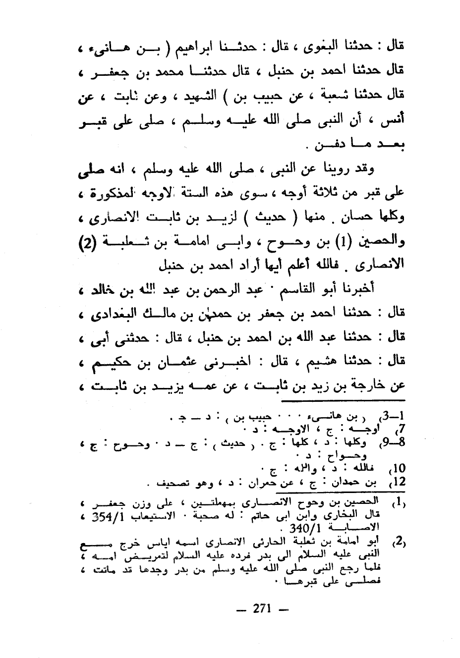 قَالَ حَدَّثَنَا الْبَغَوِيُّ قَالَ حَدَّثَنَا إِبْرَاهِيمُ (بْنُ هانىء قَالَ حَدَّثَنَا أَحْمَدُ بْنُ حَنْبَلٍ قَالَ حَدَّثَنَا مُحَمَّدُ بْنُ جَعْفَرٍ قَالَ حَدَّثَنَا شُعْبَةُ عَنْ حَبِيبِ بْنِ) الشَّهِيدِ وَعَنْ ثَابِتٍ عَنْ أَنَسٍ أَنَّ النَّبِيَّ صَلَّى اللَّهُ عَلَيْهِ وَسَلَّمَ صَلَّى على قبر بعد ما دُفِنَ وَقَدْ رُوِّينَا عَنِ النَّبِيِّ صَلَّى اللَّهُ عَلَيْهِ وَسَلَّمَ أَنَّهُ صَلَّى عَلَى قَبْرٍ مِنْ ثَلَاثَةِ أَوْجُهٍ سِوَى هَذِهِ السِّتَّةِ الْأَوْجُهِ الْمَذْكُورَةِ وَكُلُّهَا حِسَانٌ مِنْهَا (حَدِيثٌ) لِزَيْدِ بْنِ ثَابِتٍ الْأَنْصَارِيِّ وَالْحُصَيْنِ بْنِ وَحْوَحٍ وَأَبِي أُمَامَةَ بْنِ ثَعْلَبَةَ الْأَنْصَارِيِّ فَاللَّهُ أَعْلَمُ أَيَّهَا أَرَادَ أَحْمَدُ بْنُ حَنْبَلٍ أَخْبَرَنَا أَبُو الْقَاسِمِ عَبْدُ الرَّحْمَنِ بْنُ عَبْدِ اللَّهِ بْنِ خَالِدٍ قَالَ حَدَّثَنَا أَحْمَدُ بْنُ جَعْفَرِ بْنِ حَمْدَانَ بن مالك الْبَغْدَادِيُّ قَالَ حَدَّثَنَا عَبْدُ اللَّهِ بْنُ أَحْمَدَ بْنِ حَنْبَلٍ قَالَ حَدَّثَنِي أَبِي قَالَ حَدَّثَنَا هُشَيْمٌ قَالَ أَخْبَرَنِي عُثْمَانُ بْنُ حَكِيمٍ عَنْ خَارِجَةَ بْنِ زَيْدِ بْنِ ثَابِتٍ عَنْ عَمِّهِ يَزِيدَ بْنِ ثَابِتٍ