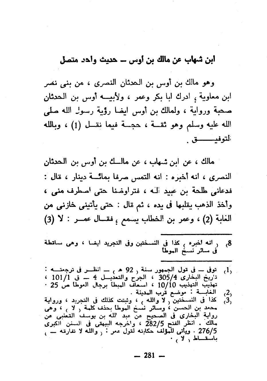 ابْنُ شِهَابٍ عَنْ مَالِكِ بْنِ أَوْسٍ حَدِيثٌ وَاحِدٌ مُتَّصِلٌ وَهُوَ مَالِكُ بْنُ أَوْسِ بْنِ الْحَدَثَانِ النَّصْرِيُّ مِنْ بَنِي نَصْرِ بْنِ مُعَاوِيَةَ أَدْرَكَ أَبَا بَكْرٍ وَعُمَرَ وَلِأَبِيهِ أَوْسِ بْنِ الْحَدَثَانِ صُحْبَةٌ وَرِوَايَةٌ وَلِمَالِكِ بْنِ أَوْسٍ أَيْضًا رُؤْيَةُ رَسُولِ اللَّهِ صَلَّى اللَّهُ عَلَيْهِ وَسَلَّمَ وَهُوَ ثِقَةٌ حُجَّةٌ فِيمَا نَقَلَ وَبِاللَّهِ التَّوْفِيقُ مَالِكٌ عَنِ ابْنِ شِهَابٍ عَنْ مَالِكِ بْنِ أَوْسِ بْنِ الْحَدَثَانِ النَّصْرِيِّ أَنَّهُ أَخْبَرَهُ أَنَّهُ الْتَمَسَ صَرْفًا بِمِائَةِ دِينَارٍ قَالَ فَدَعَانِي طَلْحَةُ بْنُ عُبَيْدٍ لَهُ فَتَرَاوَضْنَا حَتَّى اصْطَرَفَ مِنِّي وَأَخَذَ الذَّهَبَ يُقَلِّبُهَا فِي يَدِهِ ثُمَّ قَالَ حَتَّى يَأْتِيَنِي خَازِنِي مِنَ الْغَابَةِ وَعُمَرُ بْنُ الْخَطَّابِ يَسْمَعُ فَقَالَ عُمَرُ لَا