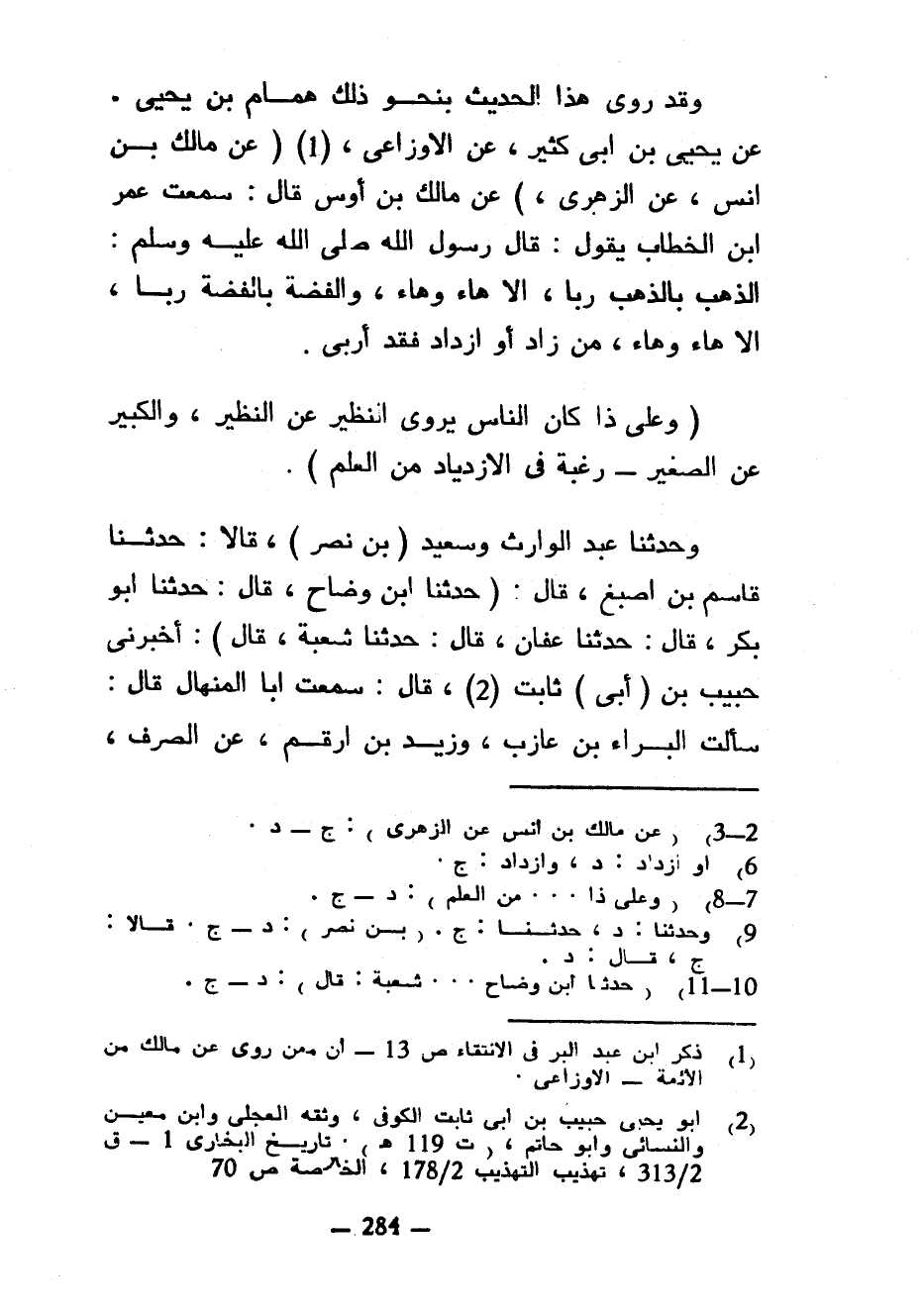 وَقَدْ رَوَى هَذَا الْحَدِيثَ بِنَحْوِ ذَلِكَ هَمَّامُ بْنُ يَحْيَى عَنْ يَحْيَى بْنِ أَبِي كَثِيرٍ عَنِ الْأَوْزَاعِيِّ (عَنْ مَالِكِ بْنِ أَنَسٍ عَنِ الزُّهْرِيِّ) عَنْ مَالِكِ بْنِ أَوْسٍ قَالَ سَمِعْتُ عُمَرَ بْنَ الْخَطَّابِ يَقُولُ قَالَ رَسُولُ اللَّهِ صَلَّى اللَّهُ عَلَيْهِ وَسَلَّمَ الذَّهَبُ بِالذَّهَبِ رِبًا إِلَّا هَاءَ وَهَاءَ وَالْفِضَّةُ بِالْفِضَّةِ رِبًا إِلَّا هَاءَ وَهَاءَ مَنْ زَادَ أَوِ ازْدَادَ فَقَدْ أَرْبَى (وَعَلَى ذَا كَانَ النَّاسُ يَرْوِي النَّظِيرُ عَنِ النَّظِيرِ وَالْكَبِيرُ عَنِ الصَّغِيرِ رَغْبَةً فِي الِازْدِيَادِ مِنَ الْعِلْمِ) وَحَدَّثَنَا عَبْدُ الْوَارِثِ وَسَعِيدُ (بْنُ نَصْرٍ) قَالَا حَدَّثَنَا قَاسِمُ بْنُ أَصْبَغَ قَالَ (حَدَّثَنَا ابْنُ وَضَّاحٍ قَالَ حَدَّثَنَا أَبُو بَكْرٍ قَالَ حَدَّثَنَا عَفَّانُ قَالَ حَدَّثَنَا شُعْبَةُ قَالَ) أَخْبَرَنِي حَبِيبُ بْنُ (أَبِي) ثَابِتٍ قَالَ سَمِعْتُ أَبَا الْمِنْهَالِ قَالَ سَأَلْتُ الْبَرَاءَ بْنَ عَازِبٍ وَزَيْدَ بْنَ أَرْقَمَ عَنِ الصَّرْفِ