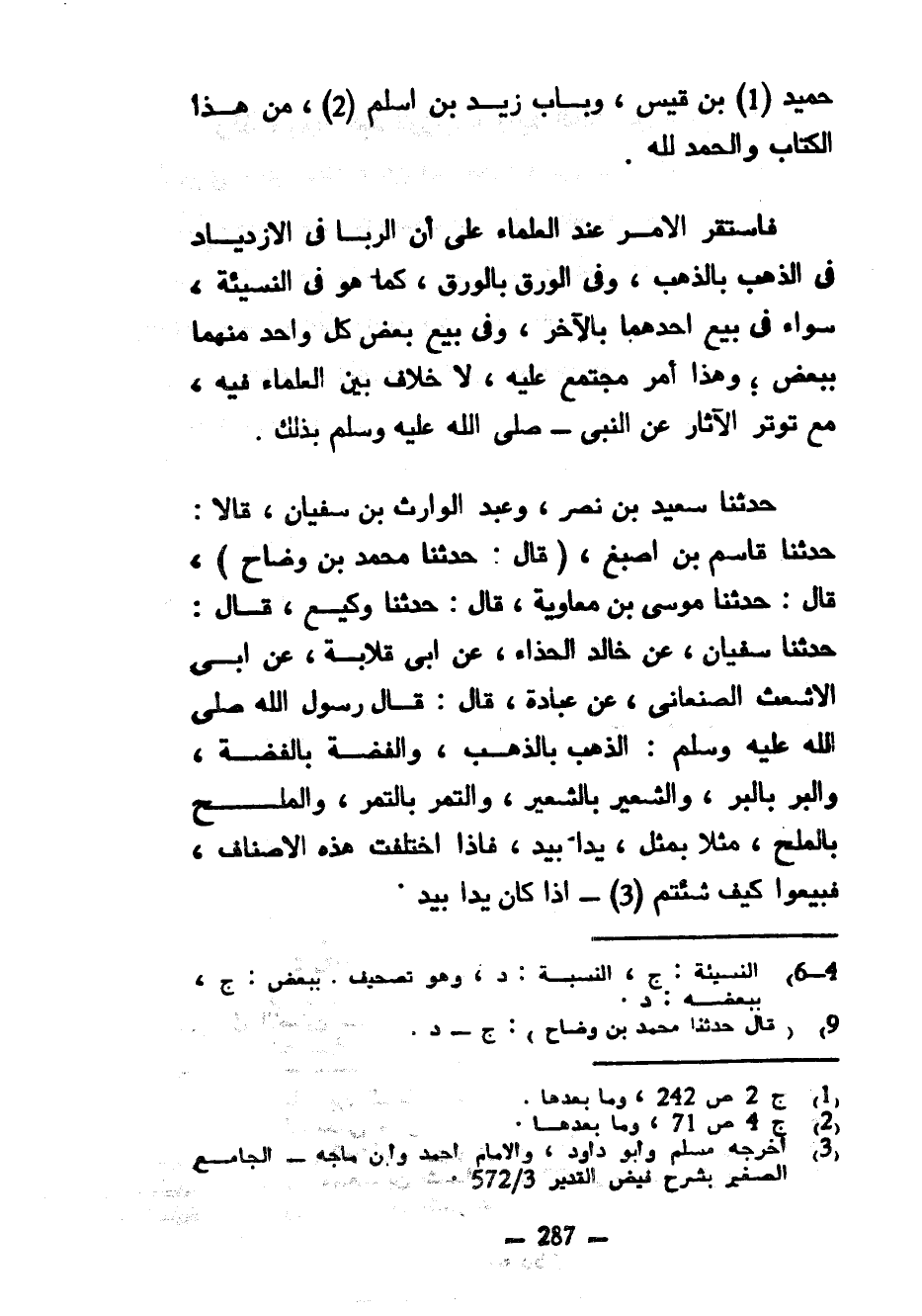 حُمَيْدِ بْنِ قَيْسٍ وَبَابِ زَيْدِ بْنِ أَسْلَمَ مِنْ هَذَا الْكِتَابِ وَالْحَمْدُ لِلَّهِ فَاسْتَقَرَّ الْأَمْرُ عِنْدَ الْعُلَمَاءِ عَلَى أَنَّ الرِّبَا فِي الِازْدِيَادِ فِي الذَّهَبِ بِالذَّهَبِ وَفِي الْوَرِقِ بِالْوَرِقِ كَمَا هُوَ فِي النَّسِيئَةِ سَوَاءٌ فِي بَيْعِ أَحَدِهِمَا بِالْآخَرِ وَفِي بَيْعِ بَعْضِ كُلِّ وَاحِدٍ مِنْهُمَا بِبَعْضٍ وَهَذَا أَمْرٌ مُجْتَمَعٌ عَلَيْهِ لَا خِلَافَ بَيْنِ الْعُلَمَاءِ فيه مع توتر الْآثَارِ عَنِ النَّبِيِّ صَلَّى اللَّهُ عَلَيْهِ وَسَلَّمَ بِذَلِكَ حَدَّثَنَا سَعِيدُ بْنُ نَصْرٍ وَعَبْدُ الْوَارِثِ بْنُ سُفْيَانَ قَالَا حَدَّثَنَا قَاسِمُ بْنُ أَصْبَغَ (قَالَ حَدَّثَنَا مُحَمَّدُ بْنُ وَضَّاحٍ) قَالَ حَدَّثَنَا مُوسَى بْنُ مُعَاوِيَةَ قَالَ حَدَّثَنَا وَكِيعٌ قَالَ حَدَّثَنَا سُفْيَانُ عَنْ خَالِدٍ الْحَذَّاءِ عَنْ أَبِي قِلَابَةَ عَنْ أَبِي الْأَشْعَثِ الصَّنْعَانِيِّ عَنْ عُبَادَةَ قَالَ قَالَ رَسُولُ اللَّهِ صَلَّى اللَّهُ عَلَيْهِ وَسَلَّمَ الذَّهَبُ بِالذَّهَبِ وَالْفِضَّةُ بِالْفِضَّةِ وَالْبُرُّ بِالْبُرِّ وَالشَّعِيرُ بِالشَّعِيرِ وَالتَّمْرُ بِالتَّمْرِ وَالْمِلْحُ بِالْمِلْحِ مِثْلًا بِمِثْلٍ يَدًا بِيَدٍ فَإِذَا اخْتَلَفَتْ هَذِهِ الْأَصْنَافُ فَبِيعُوا كَيْفَ شِئْتُمْ إذا كان يدا بيد
