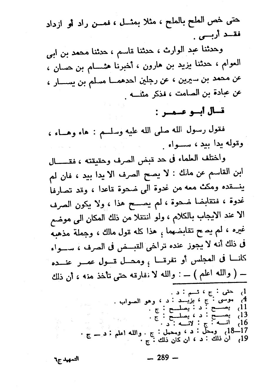 حَتَّى خَصَّ الْمِلْحَ بِالْمِلْحِ مِثْلًا بِمِثْلٍ فَمَنْ زَادَ أَوِ ازْدَادَ فَقَدْ أَرْبَى وَحَدَّثَنَا عَبْدُ الْوَارِثِ حَدَّثَنَا قَاسِمٌ حَدَّثَنَا مُحَمَّدُ بْنُ أَبِي الْعَوَّامِ حَدَّثَنَا يَزِيدُ بْنُ هَارُونَ أَخْبَرَنَا هِشَامُ بْنُ حَسَّانَ عَنْ مُحَمَّدِ بْنِ سِيرِينَ عن رجلين أحدهما مسلم بن يسار عن عبادة بْنِ الصَّامِتِ فَذَكَرَ مِثْلَهُ قَالَ أَبُو عُمَرَ فَقَوْلُ رَسُولِ اللَّهِ صَلَّى اللَّهُ عَلَيْهِ وَسَلَّمَ هَاءَ وَهَاءَ وَقَوْلُهُ يَدًا بِيَدٍ سَوَاءٌ وَاخْتَلَفَ الْعُلَمَاءُ فِي حَدِّ قَبْضِ الصَّرْفِ وَحَقِيقَتِهِ فَقَالَ ابْنُ الْقَاسِمِ عَنْ مَالِكٍ لَا يَصِحُّ الصَّرْفُ إِلَّا يَدًا بِيَدٍ فَإِنْ لَمْ يَنْتَقِدْهُ وَمَكَثَ مَعَهُ مِنْ غَدْوَةٍ إِلَى ضَحْوَةٍ قَاعِدًا وَقَدْ تَصَارَفَا غَدْوَةً فَتَقَابَضَا ضَحْوَةً لَمْ يَصِحَّ هَذَا وَلَا يَكُونُ الصَّرْفُ إِلَّا عِنْدَ الْإِيجَابِ بِالْكَلَامِ وَلَوِ انْتَقَلَا مِنْ ذَلِكَ الْمَكَانِ إِلَى مَوْضِعٍ غَيْرِهِ لَمْ يَصِحَّ تَقَابُضُهُمَا هَذَا كُلُّهُ قَوْلُ مَالِكٍ وَجُمْلَةُ مَذْهَبِهِ فِي ذَلِكَ أَنَّهُ لَا يَجُوزُ عِنْدَهُ تَرَاخِي الْقَبْضِ فِي الصَّرْفِ سَوَاءٌ كَانَا فِي الْمَجْلِسِ أَوْ تَفَرَّقَا وَمَحَلُّ قَوْلِ عمر عنده (والله أعلم) والله لا نفارقه حَتَّى تَأْخُذَ مِنْهُ أَنَّ ذَلِكَ