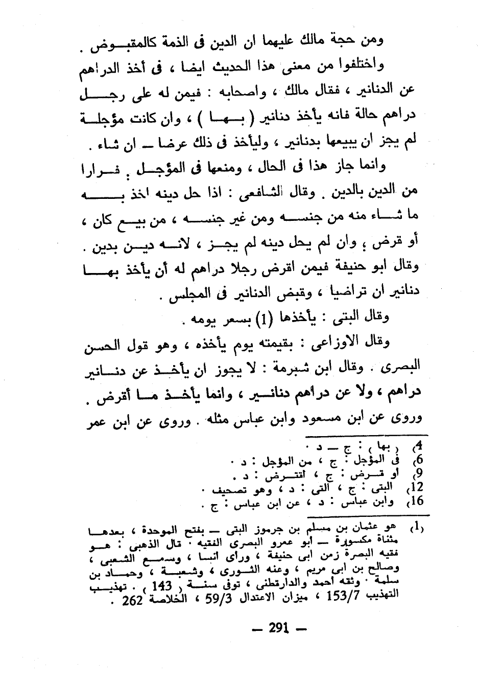 وَمِنْ حُجَّةِ مَالِكٍ عَلَيْهِمَا أَنَّ الدَّيْنَ فِي الذِّمَّةِ كَالْمَقْبُوضِ وَاخْتَلَفُوا مِنْ مَعْنَى هَذَا الْحَدِيثِ أَيْضًا فِي أَخْذِ الدَّرَاهِمِ عَنِ الدَّنَانِيرِ فَقَالَ مَالِكٌ وَأَصْحَابُهُ فِيمَنْ لَهُ عَلَى رَجُلٍ دَرَاهِمُ حَالَّةٌ فَإِنَّهُ يَأْخُذُ دَنَانِيرَ (بِهَا) وَإِنْ كَانَتْ مُؤَجَّلَةً لَمْ يَجُزْ أَنْ يَبِيعَهَا بِدَنَانِيرَ وَلْيَأْخُذْ فِي ذَلِكَ عَرَضًا إِنْ شَاءَ وَإِنَّمَا جَازَ هَذَا فِي الْحَالِّ وَمَنَعَهَا فِي الْمُؤَجَّلِ فِرَارًا مِنَ الدَّيْنِ بِالدَّيْنِ وَقَالَ الشَّافِعِيُّ إِذَا حَلَّ دَيْنُهُ أَخَذَ بِهِ مَا شَاءَ مِنْهُ مِنْ جِنْسِهِ وَمِنْ غَيْرِ جِنْسِهِ مِنْ بَيْعٍ كَانَ أَوْ قَرْضٍ وَإِنْ لَمْ يَحُلَّ دَيْنُهُ لَمْ يَجُزْ لِأَنَّهُ دَيْنٌ بِدَيْنٍ وَقَالَ أَبُو حَنِيفَةَ فِيمَنْ أَقْرَضَ رَجُلًا دَرَاهِمَ لَهُ أَنْ يَأْخُذَ بِهَا دَنَانِيرَ إِنْ تَرَاضَيَا وَقَبَضَ الدَّنَانِيرَ فِي الْمَجْلِسِ وَقَالَ الْبَتِّيُّ يَأْخُذُهَا بِسِعْرِ يَوْمِهِ وَقَالَ الْأَوْزَاعِيُّ بِقِيمَتِهِ يَوْمَ يَأْخُذُهُ وَهُوَ قَوْلُ الْحَسَنِ الْبَصْرِيِّ وَقَالَ ابْنُ شُبْرُمَةَ لَا يَجُوزُ أَنْ يَأْخُذَ عَنْ دَنَانِيرَ دَرَاهِمَ وَلَا عَنْ دَرَاهِمَ دَنَانِيرَ وَإِنَّمَا يَأْخُذُ مَا أُقْرِضَ وَرُوِيَ عَنِ ابْنِ مَسْعُودٍ وَابْنِ عَبَّاسٍ مِثْلُهُ وَرُوِيَ عَنِ ابن عمر