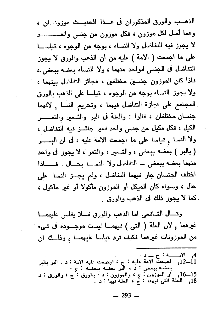 الذَّهَبُ وَالْوَرِقُ الْمَذْكُورَانِ فِي هَذَا الْحَدِيثِ مَوْزُونَانِ وَهُمَا أَصْلٌ لِكُلِّ مَوْزُونٍ فَكُلُّ مَوْزُونٍ مِنْ جِنْسٍ وَاحِدٍ لَا يَجُوزُ فِيهِ التَّفَاضُلُ وَلَا النَّسَاءُ بِوَجْهٍ مِنَ الْوُجُوهِ قِيَاسًا عَلَى مَا أَجْمَعَتِ (الْأُمَّةُ) عَلَيْهِ مِنْ أَنَّ الذَّهَبَ وَالْوَرِقَ لَا يَجُوزُ التَّفَاضُلُ فِي الْجِنْسِ الْوَاحِدِ مِنْهُمَا وَلَا النَّسَاءُ بَعْضُهُ بِبَعْضٍ فَإِذَا كَانَ الْمَوْزُونُ جِنْسَيْنِ مُخْتَلِفَيْنِ فَجَائِزٌ التَّفَاضُلُ بَيْنَهُمَا وَلَا يَجُوزُ النَّسَاءُ بِوَجْهٍ مِنَ الْوُجُوهِ قِيَاسًا عَلَى الذَّهَبِ بِالْوَرِقِ الْمُجْتَمَعِ عَلَى إِجَازَةِ التَّفَاضُلِ فِيهِمَا وَتَحْرِيمِ النسا لِأَنَّهُمَا جِنْسَانِ مُخْتَلِفَانِ قَالُوا وَالْعِلَّةُ فِي الْبُرِّ وَالشَّعِيرِ وَالتَّمْرِ الْكَيْلُ فَكُلُّ مَكِيلٍ مِنْ جِنْسٍ واحد فغير جَائِزٌ فِيهِ التَّفَاضُلُ وَلَا النَّسَا قِيَاسًا عَلَى مَا أَجْمَعَتِ الْأُمَّةُ عَلَيْهِ فِي أَنَّ الْبُرَّ (بِالْبُرِّ) بَعْضَهُ بِبَعْضٍ وَالشَّعِيرُ وَالتَّمْرُ لَا يَجُوزُ فِي وَاحِدٍ مِنْهُمَا بَعْضُهُ بِبَعْضٍ التَّفَاضُلُ وَلَا النَّسَا بِحَالٍ فَإِذَا اخْتَلَفَ الْجِنْسَانِ جَازَ فِيهِمَا التَّفَاضُلُ وَلَمْ يَجُزِ النَّسَا عَلَى حَالٍ وَسَوَاءٌ كَانَ الْمَكِيلُ أَوِ الْمَوْزُونُ مَأْكُولًا أَوْ غَيْرَ مَأْكُولٍ كَمَا لَا يَجُوزُ ذَلِكَ فِي الذَّهَبِ وَالْوَرِقِ وَقَالَ الشَّافِعِيُّ أَمَّا الذَّهَبُ وَالْوَرِقُ فَلَا يُقَاسُ عَلَيْهِمَا غَيْرُهُمَا لِأَنَّ الْعِلَّةَ (الَّتِي) فِيهِمَا لَيْسَتْ مَوْجُودَةً فِي شَيْءٍ مِنَ الْمَوْزُونَاتِ غَيْرَهُمَا فَكَيْفَ تَرِدُ قِيَاسًا عَلَيْهِمَا وَذَلِكَ أَنَّ