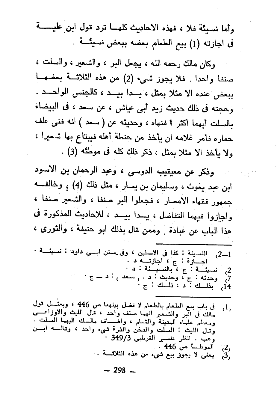 وَأَمَّا نَسِيئَةً فَلَا فَهَذِهِ الْأَحَادِيثُ كُلُّهَا تَرُدُّ قَوْلَ ابْنِ عُلَيَّةَ فِي إِجَازَتِهِ بَيْعَ الطَّعَامِ بَعْضِهِ بِبَعْضٍ نَسِيئَةً وَكَانَ مَالِكٌ رَحِمَهُ اللَّهُ يَجْعَلُ الْبُرَّ وَالشَّعِيرَ وَالسُّلْتَ صِنْفًا وَاحِدًا فَلَا يَجُوزُ شَيْءٌ مِنْ هَذِهِ الثَّلَاثَةِ بَعْضِهَا بِبَعْضٍ عِنْدَهُ إِلَّا مِثْلًا بِمِثْلٍ يَدًا بِيَدٍ كَالْجِنْسِ الْوَاحِدِ وَحُجَّتُهُ فِي ذَلِكَ حَدِيثُ زَيْدٍ أَبِي عَيَّاشٍ عَنْ سَعْدٍ فِي الْبَيْضَاءِ بِالسُّلْتِ أَيُّهُمَا أَكْثَرُ فَنَهَاهُ وَحَدِيثُهُ عَنْ (سَعْدٍ) أَنَّهُ فَنِيَ عَلَفُ حِمَارِهِ فَأَمَرَ غُلَامَهُ أَنْ يَأْخُذَ مِنْ حِنْطَةِ أَهْلِهِ فَيَبْتَاعَ بِهَا شَعِيرًا وَلَا يَأْخُذَ إِلَّا مِثْلًا بِمِثْلٍ ذَكَرَ ذَلِكَ كُلَّهُ فِي مُوَطَّئِهِ وَذَكَرَ عَنْ مُعَيْقِيبِ الدَّوْسِيِّ وَعَبْدِ الرَّحْمَنِ بْنِ الْأَسْوَدِ بْنِ عَبْدِ يَغُوثَ وَسُلَيْمَانَ بْنِ يَسَارٍ مِثْلَ ذَلِكَ وَخَالَفَهُ جُمْهُورُ فُقَهَاءِ الْأَمْصَارِ فَجَعَلُوا الْبُرَّ صِنْفًا وَالشَّعِيرَ صِنْفًا وَأَجَازُوا فِيهِمَا التَّفَاضُلَ يَدًا بِيَدٍ لِلْأَحَادِيثِ الْمَذْكُورَةِ فِي هَذَا الْبَابِ عَنْ عُبَادَةَ وَمِمَّنْ قَالَ بِذَلِكَ أَبُو حَنِيفَةَ وَالثَّوْرِيُّ