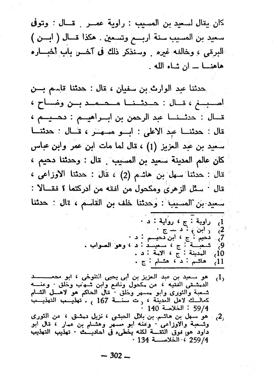 كَانَ يُقَالُ لِسَعِيدِ بْنِ الْمُسَيَّبِ رَاوِيَةُ عُمَرَ قَالَ وَتُوُفِّيَ سَعِيدُ بْنُ الْمُسَيَّبِ سَنَةَ أَرْبَعٍ وَتِسْعِينَ هَكَذَا قَالَ (ابْنُ) الْبَرْقِيِّ وَخَالَفَهُ غَيْرُهُ وَسَنَذْكُرُ ذَلِكَ فِي آخِرِ بَابِ أَخْبَارِهِ هَاهُنَا إِنْ شَاءَ اللَّهُ حَدَّثَنَا عَبْدُ الْوَارِثِ بْنُ سُفْيَانَ قَالَ حَدَّثَنَا قَاسِمُ بْنُ أَصْبَغَ قَالَ حَدَّثَنَا مُحَمَّدُ بْنُ وَضَّاحٍ قَالَ حَدَّثَنَا عَبْدُ الرَّحْمَنِ بْنُ إِبْرَاهِيمَ دُحَيْمٌ قَالَ حَدَّثَنَا عَبْدُ الْأَعْلَى أَبُو مُسْهِرٍ قَالَ حَدَّثَنَا سَعِيدُ بْنُ عَبْدِ الْعَزِيزِ قَالَ لَمَّا مَاتَ ابْنُ عُمَرَ وَابْنُ عَبَّاسٍ كَانَ عَالِمُ الْمَدِينَةِ سَعِيدَ بْنَ الْمُسَيَّبِ قَالَ وَحَدَّثَنَا دُحَيْمٌ قَالَ حَدَّثَنَا سَهْلُ بْنُ هَاشِمٍ قَالَ حَدَّثَنَا الْأَوْزَاعِيُّ قَالَ سُئِلَ الزُّهْرِيُّ وَمَكْحُولٌ مَنْ أَفْقَهُ مَنْ أَدْرَكْتُمَا فَقَالَا سَعِيدُ بْنُ الْمُسَيَّبِ وَحَدَّثَنَا خَلَفُ بْنُ الْقَاسِمِ قَالَ حَدَّثَنَا