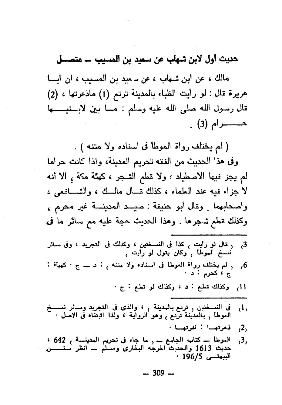 حَدِيثٌ أَوَّلٌ لِابْنِ شِهَابٍ عَنْ سَعِيدِ بْنِ الْمُسَيَّبِ مُتَّصِلٌ مَالِكٌ عَنِ ابْنِ شِهَابٍ عَنْ سَعِيدِ بْنِ الْمُسَيَّبِ أَنَّ أَبَا هُرَيْرَةَ قَالَ لَوْ رَأَيْتُ الظِّبَاءَ بِالْمَدِينَةِ تَرْتَعُ مَا ذَعَرْتُهَا قَالَ رَسُولُ اللَّهِ صَلَّى اللَّهُ عَلَيْهِ وَسَلَّمَ مَا بَيْنَ لَابَتَيْهَا حَرَامٌ (لَمْ يَخْتَلِفْ رُوَاةُ الموطأ في إسناده ولامتنه) وَفِي هَذَا الْحَدِيثِ مِنَ الْفِقْهِ تَحْرِيمُ الْمَدِينَةِ وَإِذَا كَانَتْ حَرَامًا لَمْ يَجُزْ فِيهَا الِاصْطِيَادُ ولا قطع الشجر كهئة مَكَّةَ إِلَّا أَنَّهُ لَا جَزَاءَ فِيهِ عِنْدَ الْعُلَمَاءِ كَذَلِكَ قَالَ مَالِكٌ وَالشَّافِعِيُّ وَأَصْحَابُهُمَا وَقَالَ أَبُو حَنِيفَةَ صَيْدٌ الْمَدِينَةِ غَيْرُ مُحَرَّمٍ وَكَذَلِكَ قَطْعُ شَجَرِهَا وَهَذَا الْحَدِيثُ حُجَّةٌ عَلَيْهِ مَعَ سَائِرِ مَا فِي