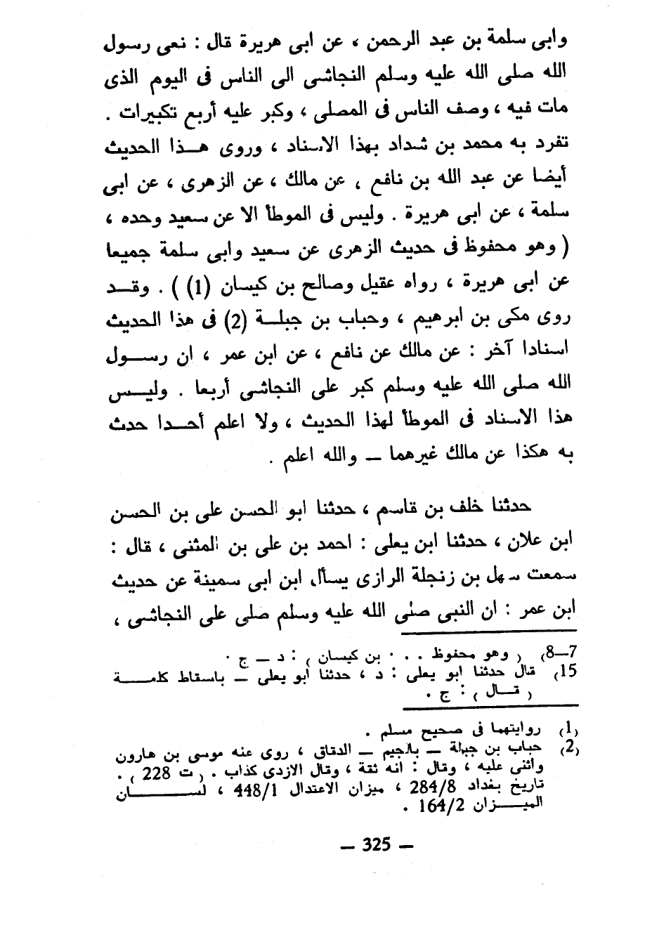 وَأَبِي سَلَمَةَ بْنِ عَبْدِ الرَّحْمَنِ عَنْ أَبِي هُرَيْرَةَ قَالَ نَعَى رَسُولُ اللَّهِ صَلَّى اللَّهُ عَلَيْهِ وَسَلَّمَ النَّجَاشِيَّ إِلَى النَّاسِ فِي الْيَوْمِ الَّذِي مَاتَ فِيهِ وَصَفَّ النَّاسَ فِي الْمُصَلَّى وَكَبَّرَ عَلَيْهِ أَرْبَعَ تَكْبِيرَاتٍ تَفَرَّدَ بِهِ مُحَمَّدُ بْنُ شَدَّادٍ بِهَذَا الْإِسْنَادِ وَرُوِيَ هَذَا الْحَدِيثُ أَيْضًا عَنْ عَبْدِ اللَّهِ بْنِ نَافِعٍ عَنْ مَالِكٍ عَنِ الزُّهْرِيِّ عَنْ أَبِي سَلَمَةَ عَنْ أَبِي هُرَيْرَةَ وَلَيْسَ فِي الْمُوَطَّأِ إِلَّا عَنْ سَعِيدٍ وَحْدَهُ (وَهُوَ مَحْفُوظٌ فِي حَدِيثِ الزُّهْرِيِّ عَنْ سَعِيدٍ وَأَبِي سَلَمَةَ جَمِيعًا عَنْ أَبِي هُرَيْرَةَ رَوَاهُ عُقَيْلٌ وَصَالِحُ بْنُ كَيْسَانَ (1)) وَقَدْ رَوَى مَكِّيُّ بْنُ إِبْرَاهِيمَ وَحُبَابُ بْنُ جَبَلَةَ فِي هَذَا الْحَدِيثِ إِسْنَادًا آخَرَ عَنْ مَالِكٍ عَنْ نَافِعٍ عَنِ ابْنِ عُمَرَ أَنَّ رَسُولَ اللَّهِ صَلَّى اللَّهُ عَلَيْهِ وَسَلَّمَ كَبَّرَ عَلَى النَّجَاشِيِّ أَرْبَعًا وَلَيْسَ هَذَا الْإِسْنَادُ فِي الْمُوَطَّأِ لِهَذَا الْحَدِيثِ وَلَا أَعْلَمُ أَحَدًا حَدَّثَ بِهِ هَكَذَا عَنْ مَالِكٍ غَيْرَهُمَا وَاللَّهُ أَعْلَمُ حَدَّثَنَا خَلَفُ بْنُ قَاسِمٍ حَدَّثَنَا أَبُو الْحَسَنِ عَلِيُّ بْنُ الْحَسَنِ بْنِ عَلَّانَ حَدَّثَنَا ابْنُ يَعْلَى أَحْمَدُ بْنُ عَلِيِّ بْنِ الْمُثَنَّى قَالَ سَمِعْتُ سَهْلَ بْنَ زَنْجَلَةَ الرَّازِيَّ يَسْأَلُ ابْنَ أَبِي سمينة عن حديث بْنِ عُمَرَ أَنَّ النَّبِيَّ صَلَّى اللَّهُ عَلَيْهِ وَسَلَّمَ صَلَّى عَلَى النَّجَاشِيِّ