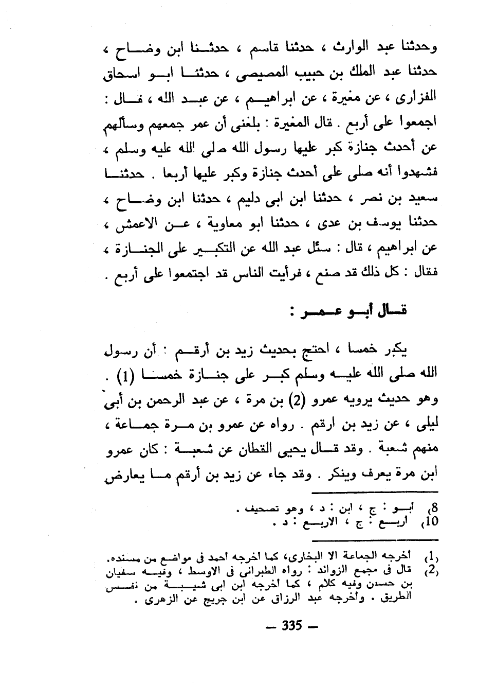 وَحَدَّثَنَا عَبْدُ الْوَارِثِ حَدَّثَنَا قَاسِمٌ حَدَّثَنَا ابْنُ وَضَّاحٍ حَدَّثَنَا عَبْدُ الْمَلِكِ بْنُ حَبِيبٍ الْمِصِّيصِيُّ حَدَّثَنَا أَبُو إِسْحَاقَ الْفَزَارِيُّ عَنْ مُغِيرَةَ عَنْ إِبْرَاهِيمَ عَنْ عَبْدِ اللَّهِ قَالَ أَجْمَعُوا عَلَى أَرْبَعٍ قَالَ الْمُغِيرَةُ بَلَغَنِي أَنَّ عُمَرَ جَمَعَهُمْ وَسَأَلَهُمْ عَنْ أَحْدَثِ جِنَازَةٍ كَبَّرَ عَلَيْهَا رَسُولُ اللَّهِ صَلَّى اللَّهُ عَلَيْهِ وَسَلَّمَ فَشَهِدُوا أَنَّهُ صَلَّى عَلَى أَحْدَثِ جِنَازَةٍ وَكَبَّرَ عَلَيْهَا أَرْبَعًا حَدَّثَنَا سَعِيدُ بْنُ نَصْرٍ حَدَّثَنَا ابْنُ أَبِي دُلَيْمٍ حَدَّثَنَا ابْنُ وَضَّاحٍ حَدَّثَنَا يُوسُفُ بْنُ عَدِيٍّ حَدَّثَنَا أَبُو مُعَاوِيَةَ عَنِ الْأَعْمَشِ عَنْ إِبْرَاهِيمَ قَالَ سُئِلَ عَبْدُ اللَّهِ عَنِ التَّكْبِيرِ عَلَى الْجِنَازَةِ فَقَالَ كُلُّ ذَلِكَ قَدْ صُنِعَ فَرَأَيْتُ النَّاسَ قَدِ اجْتَمَعُوا عَلَى أَرْبَعٍ قَالَ أَبُو عُمَرَ يُكَبِّرُ خَمْسًا احْتَجَّ بِحَدِيثِ زَيْدِ بْنِ أَرْقَمَ أَنَّ رَسُولَ اللَّهِ صَلَّى اللَّهُ عَلَيْهِ وَسَلَّمَ كَبَّرَ عَلَى جِنَازَةٍ خَمْسًا وَهُوَ حَدِيثٌ يَرْوِيهِ عَمْرُو بْنُ مُرَّةَ عَنْ عَبْدِ الرَّحْمَنِ بْنِ أَبِي لَيْلَى عَنْ زَيْدِ بْنِ أَرْقَمَ رَوَاهُ عَنْ عَمْرِو بْنِ مُرَّةَ جَمَاعَةٌ مِنْهُمْ شُعْبَةُ وَقَدْ قَالَ يَحْيَى الْقَطَّانُ عَنْ شُعْبَةَ كَانَ عَمْرُو بْنُ مُرَّةَ يَعْرِفُ وَيُنْكِرُ وَقَدْ جَاءَ عَنْ زَيْدِ بْنِ أَرْقَمَ مَا يعارض