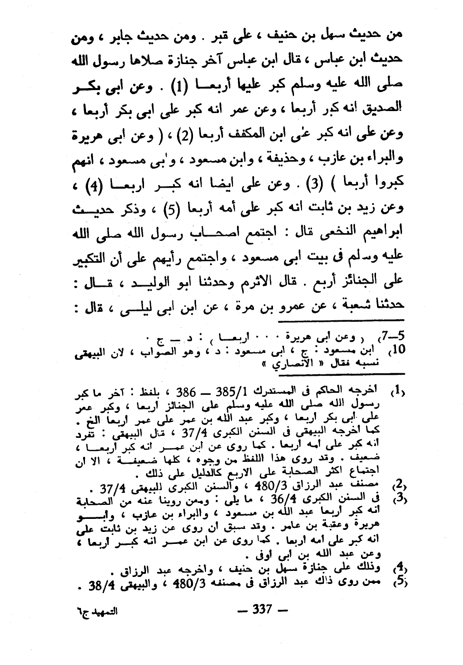 مِنْ حَدِيثِ سَهْلِ بْنِ حُنَيْفٍ عَلَى قَبْرٍ وَمِنْ حَدِيثِ جَابِرٍ وَمِنْ حَدِيثِ ابْنِ عَبَّاسٍ قَالَ ابْنُ عَبَّاسٍ آخِرُ جِنَازَةٍ صَلَّاهَا رَسُولَ اللَّهِ صَلَّى اللَّهُ عَلَيْهِ وَسَلَّمَ كَبَّرَ عَلَيْهَا أَرْبَعًا وَعَنْ أَبِي بَكْرٍ الصِّدِيقِ أَنَّهُ كَبَّرَ أَرْبَعًا وَعَنْ عُمَرَ أَنَّهُ كَبَّرَ عَلَى أَبِي بَكْرٍ أَرْبَعًا وَعَنْ عَلِيٍّ أَنَّهُ كَبَّرَ عَلَى ابْنِ الْمُكَفَّفِ أَرْبَعًا (وَعَنْ أَبِي هُرَيْرَةَ وَالْبَرَاءِ بْنِ عَازِبٍ وَحُذَيْفَةَ وَابْنِ مَسْعُودٍ وَأَبِي مَسْعُودٍ أَنَّهُمْ كَبَّرُوا أَرْبَعًا) وَعَنْ عَلِيٍّ أَيْضًا أَنَّهُ كَبَّرَ أَرْبَعًا وَعَنْ زَيْدِ بْنِ ثَابِتٍ أَنَّهُ كَبَّرَ عَلَى أُمِّهِ أَرْبَعًا وَذَكَرَ حَدِيثَ إِبْرَاهِيمَ النَّخَعِيِّ قَالَ اجْتَمَعَ أَصْحَابُ رَسُولِ اللَّهِ صَلَّى اللَّهُ عَلَيْهِ وَسَلَّمَ فِي بَيْتِ أَبِي مَسْعُودٍ وَاجْتَمَعَ رَأْيُهُمْ عَلَى أَنَّ التَّكْبِيرَ عَلَى الْجَنَائِزِ أَرْبَعٌ قَالَ الْأَثْرَمُ وَحَدَّثَنَا أَبُو الْوَلِيدِ قَالَ حَدَّثَنَا شُعْبَةُ عَنْ عَمْرِو بْنِ مُرَّةَ عَنْ ابْنِ أَبِي لَيْلَى قَالَ