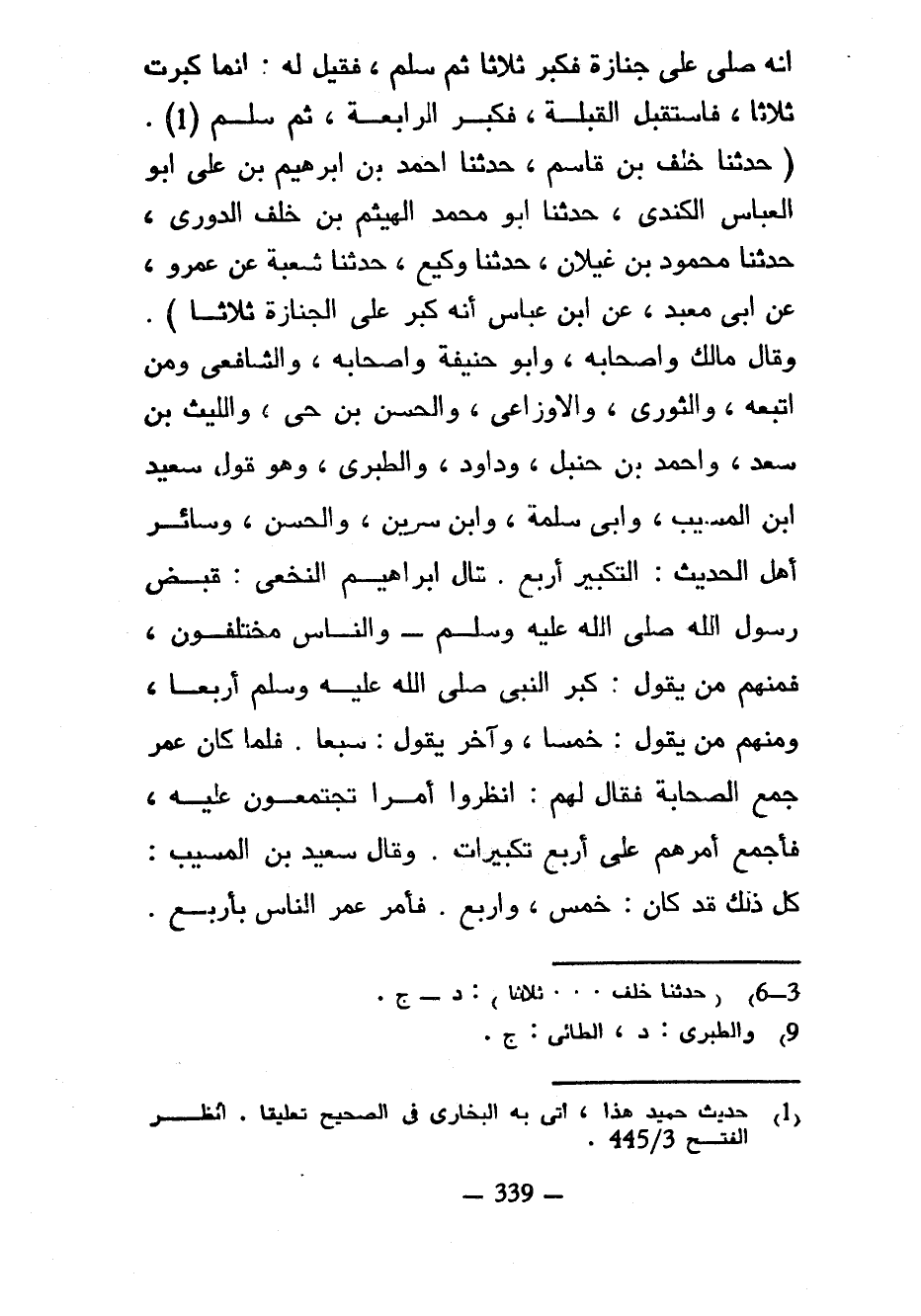 أَنَّهُ صَلَّى عَلَى جِنَازَةٍ فَكَبَّرَ ثَلَاثًا ثُمَّ سَلَّمَ فَقِيلَ لَهُ إِنَّمَا كَبَّرْتَ ثَلَاثًا فَاسْتَقْبَلَ الْقِبْلَةَ فَكَبَّرَ الرَّابِعَةَ ثُمَّ سَلَّمَ (حَدَّثَنَا خَلَفُ بْنُ قَاسِمٍ حَدَّثَنَا أَحْمَدُ بْنُ إِبْرَاهِيمَ بْنِ علي أبو العباس الكندي حَدَّثَنَا أَبُو مُحَمَّدٍ الْهَيْثَمُ بْنُ خَلَفٍ الدُّورِيُّ حَدَّثَنَا مَحْمُودُ بْنُ غَيْلَانَ حَدَّثَنَا وَكِيعٌ حَدَّثَنَا شُعْبَةُ عَنْ عَمْرٍو عَنْ أَبِي مَعْبَدٍ عَنِ ابْنِ عَبَّاسٍ أَنَّهُ كَبَّرَ عَلَى الْجِنَازَةِ ثَلَاثًا) وَقَالَ مَالِكٌ وَأَصْحَابُهُ وَأَبُو حَنِيفَةَ وَأَصْحَابُهُ وَالشَّافِعِيُّ وَمَنِ اتَّبَعَهُ وَالثَّوْرِيُّ وَالْأَوْزَاعِيُّ وَالْحَسَنُ بْنُ حَيٍّ وَاللَّيْثُ بْنُ سَعْدٍ وَأَحْمَدُ بْنُ حَنْبَلٍ وَدَاوُدُ وَالطَّبَرِيُّ وَهُوَ قَوْلُ سَعِيدِ بْنِ الْمُسَيَّبِ وَأَبِي سَلَمَةَ وَابْنِ سِيرِينَ وَالْحَسَنِ وَسَائِرِ أَهْلِ الْحَدِيثِ التَّكْبِيرُ أَرْبَعٌ قَالَ إِبْرَاهِيمُ النَّخَعِيُّ قُبِضَ رَسُولُ اللَّهِ صَلَّى اللَّهُ عَلَيْهِ وَسَلَّمَ وَالنَّاسُ مُخْتَلِفُونَ فَمِنْهُمْ مَنْ يَقُولُ كَبَّرَ النَّبِيُّ صَلَّى اللَّهُ عَلَيْهِ وَسَلَّمَ أَرْبَعًا وَمِنْهُمْ مَنْ يَقُولُ خَمْسًا وَآخَرُ يَقُولُ سَبْعًا فَلَمَّا كَانَ عُمَرُ جَمَعَ الصَّحَابَةَ فَقَالَ لَهُمُ انْظُرُوا أَمْرًا تَجْتَمِعُونَ عَلَيْهِ فَأَجْمَعَ أَمْرُهُمْ عَلَى أَرْبَعِ تَكْبِيرَاتٍ وَقَالَ سَعِيدُ بْنُ الْمُسَيَّبِ كُلُّ ذَلِكَ قَدْ كَانَ خَمْسٌ وَأَرْبَعٌ فَأَمَرَ عُمَرُ النَّاسَ بِأَرْبَعٍ