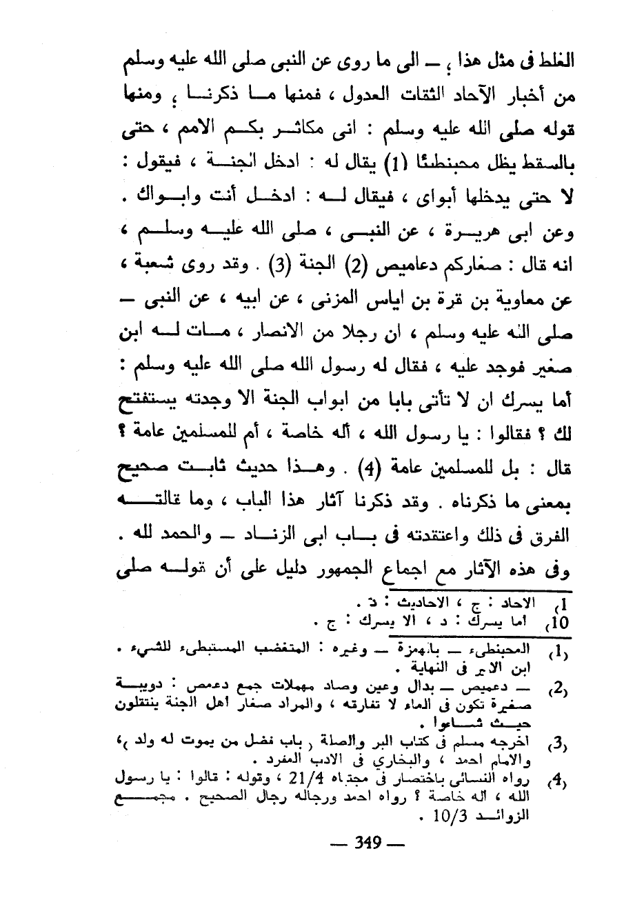 الْغَلَطُ فِي مِثْلِ هَذَا إِلَى مَا رُوِيَ عَنِ النَّبِيِّ صَلَّى اللَّهُ عَلَيْهِ وسلم من أَخْبَارِ الْآحَادِ الثِّقَاتِ الْعُدُولِ فَمِنْهَا مَا ذَكَرْنَا وَمِنْهَا قَوْلُهُ صَلَّى اللَّهُ عَلَيْهِ وَسَلَّمَ إِنِّي مُكَاثِرٌ بِكُمُ الْأُمَمَ حَتَّى بِالسَّقْطِ يَظَلُّ مُحْبَنْطِئًا يُقَالُ لَهُ ادْخُلِ الْجَنَّةَ فَيَقُولُ لَا حَتَّى يَدْخُلَهَا أَبَوَايْ فَيُقَالُ لَهُ ادْخُلْ أَنْتَ وَأَبَوَاكَ وَعَنْ أَبِي هُرَيْرَةَ عَنِ النَّبِيِّ صَلَّى اللَّهُ عَلَيْهِ وَسَلَّمَ أَنَّهُ قَالَ صِغَارُكُمْ دَعَامِيصُ الْجَنَّةِ وَقَدْ رَوَى شُعْبَةُ عَنْ مُعَاوِيَةَ بْنِ قُرَّةَ بْنِ إِيَاسٍ الْمُزَنِيِّ عَنْ أَبِيهِ عَنِ النَّبِيِّ صَلَّى اللَّهُ عَلَيْهِ وَسَلَّمَ أَنَّ رَجُلًا مَنَ الْأَنْصَارِ مَاتَ لَهُ ابْنٌ صَغِيرٌ فَوَجَدَ عَلَيْهِ فَقَالَ لَهُ رَسُولُ اللَّهِ صَلَّى اللَّهُ عَلَيْهِ وَسَلَّمَ أَمَا يُسُرُّكَ أَنْ لَا تَأْتِيَ بَابًا مِنْ أَبْوَابِ الْجَنَّةِ إِلَّا وَجَدْتَهُ يَسْتَفْتِحُ لَكَ فَقَالُوا يَا رَسُولَ اللَّهِ أَلَهُ خَاصَّةً أَمْ لِلْمُسْلِمِينَ عَامَّةً قَالَ بَلْ لِلْمُسْلِمِينَ عَامَّةً وَهَذَا حَدِيثٌ ثَابِتٌ صَحِيحٌ بِمَعْنَى مَا ذَكَرْنَاهُ وَقَدْ ذَكَرْنَا آثَارَ هَذَا الْبَابِ وَمَا قَالَتْهُ الْفِرَقُ فِي ذَلِكَ وَاعْتَقَدَتْهُ فِي بَابِ أَبِي الزِّنَادِ وَالْحَمْدُ لِلَّهِ وَفِي هَذِهِ الْآثَارِ مَعَ إِجْمَاعِ الْجُمْهُورِ دَلِيلٌ عَلَى أَنَّ قَوْلَهُ صَلَّى