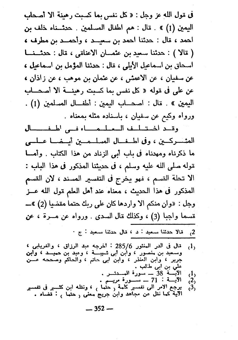 فِي قَوْلِ اللَّهِ عَزَّ وَجَلَّ كُلُّ نَفْسٍ بِمَا كَسَبَتْ رَهِينَةٌ إِلَّا أَصْحَابَ الْيَمِينِ قَالَ هُمْ أَطْفَالُ الْمُسْلِمِينَ حَدَّثَنَاهُ خَلَفُ بْنُ أَحْمَدَ قَالَ حَدَّثَنَا أَحْمَدُ بْنُ سَعِيدٍ وَأَحْمَدُ بْنُ مُطَرِّفٍ (قَالَا) حَدَّثَنَا سَعِيدُ بْنُ عُثْمَانَ الْأَعْنَاقِيُّ قَالَ حَدَّثَنَا إِسْحَاقُ بْنُ إِسْمَاعِيلَ الْأَيْلِيُّ قَالَ حَدَّثَنَا الْمُؤَمَّلُ بْنُ إِسْمَاعِيلَ عَنْ سُفْيَانَ عَنِ الْأَعْمَشِ عَنْ عُثْمَانَ بْنِ مَوْهَبٍ عَنْ زَاذَانَ عَنْ عَلِيٍّ فِي قَوْلِهِ كُلُّ نَفْسٍ بِمَا كَسَبَتْ رَهِينَةٌ إِلَّا أَصْحَابَ الْيَمِينِ قَالَ أَصْحَابُ الْيَمِينِ أَطْفَالُ الْمُسْلِمِينَ وَرَوَاهُ وَكِيعٌ عَنْ سُفْيَانَ بِإِسْنَادِهِ مِثْلَهُ بِمَعْنَاهُ وَقَدِ اخْتَلَفَ الْعُلَمَاءُ فِي أَطْفَالِ الْمُشْرِكِينَ وَفِي أَطْفَالِ الْمُسْلِمِينَ أَيْضًا عَلَى مَا ذَكَرْنَاهُ وَمَهَّدْنَاهُ فِي بَابِ أَبِي الزِّنَادِ مِنْ هَذَا الْكِتَابِ وَأَمَّا قَوْلُهُ صَلَّى اللَّهُ عَلَيْهِ وَسَلَّمَ فِي حَدِيثِنَا الْمَذْكُورِ فِي هَذَا الْبَابِ إِلَّا تَحِلَّةَ الْقَسَمِ فَهُوَ يُخَرَّجُ فِي التَّفْسِيرِ الْمُسْنَدِ لِأَنَّ الْقَسَمَ الْمَذْكُورَ فِي هَذَا الْحَدِيثِ مَعْنَاهُ عِنْدَ أَهْلِ الْعِلْمِ قَوْلُ اللَّهِ عَزَّ وَجَلَّ وَإِنْ مِنْكُمْ إِلَّا وَارِدُهَا كَانَ عَلَى رَبِّكَ حَتْمًا مَقْضِيًّا قَسَمًا وَاجِبًا وَكَذَلِكَ قَالَ السُّدِّيُّ وَرَوَاهُ عَنْ مُرَّةَ عَنْ