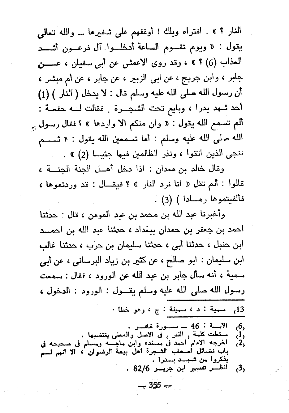 النَّارَ أَفَتَرَاهُ وَيْلَكَ أَوْقَفَهُمْ عَلَى شَفِيرِهَا وَاللَّهُ تَعَالَى يَقُولُ وَيَوْمَ تَقُومُ السَّاعَةُ أَدْخِلُوا آلَ فِرْعَوْنَ أَشَدَّ الْعَذَابِ وَقَدْ رَوَى الْأَعْمَشُ عَنْ أَبِي سُفْيَانَ عَنْ جَابِرٍ وَابْنِ جُرَيْجٍ عَنْ أَبِي الزُّبَيْرِ عَنْ جَابِرٍ عَنْ أُمِّ مُبَشِّرٍ أن رسول الله صلى الله عليه وسلم قَالَ لَا يَدْخُلُ (النَّارَ) أَحَدٌ شَهِدَ بَدْرًا وَبَايَعَ تَحْتَ الشَّجَرَةِ فَقَالَتْ لَهُ حَفْصَةُ أَلَمْ تَسْمَعِ اللَّهَ يَقُولُ وَإِنْ مِنْكُمْ إِلَّا وَارِدُهَا فَقَالَ رَسُولُ اللَّهِ صَلَّى اللَّهُ عَلَيْهِ وَسَلَّمَ أَمَا تَسْمَعِينَ اللَّهَ يَقُولُ ثُمَّ نُنَجِّي الَّذِينَ اتَّقَوْا وَنَذَرُ الظَّالِمِينَ فِيهَا جِثِيًّا وَقَالَ خَالِدُ بْنُ مَعْدَانَ إِذَا دَخَلَ أَهْلُ الْجَنَّةِ الْجَنَّةَ قَالُوا أَلَمْ تَقُلْ ((إِنَّا نَرِدُ النَّارَ)) فَيُقَالُ قَدْ وَرَدْتُمُوهَا فَأَلْفَيْتُمُوهَا رَمَادًا) وَأَخْبَرَنَا عَبْدُ اللَّهِ بْنُ مُحَمَّدِ بْنِ عَبْدِ الْمُؤْمِنِ قَالَ حَدَّثَنَا أَحْمَدُ بْنُ جَعْفَرِ بْنِ حَمْدَانَ بِبَغْدَادَ حَدَّثَنَا عبد الله بن أحمد ابن حَنْبَلٍ حَدَّثَنَا أَبِي حَدَّثَنَا سُلَيْمَانُ بْنُ حَرْبٍ حدثنا غالب ابن سُلَيْمَانَ أَبُو صَالِحٍ عَنْ كَثِيرِ بْنِ زِيَادٍ الْبُرْسَانِيِّ عَنْ أَبِي سُمَيَّةَ أَنَّهُ سَأَلَ جَابِرَ بْنَ عَبْدِ اللَّهِ عَنِ الْوُرُودِ فَقَالَ سَمِعْتُ رَسُولَ اللَّهِ صَلَّى اللَّهُ عَلَيْهِ وسلم يقول الورود الدخول