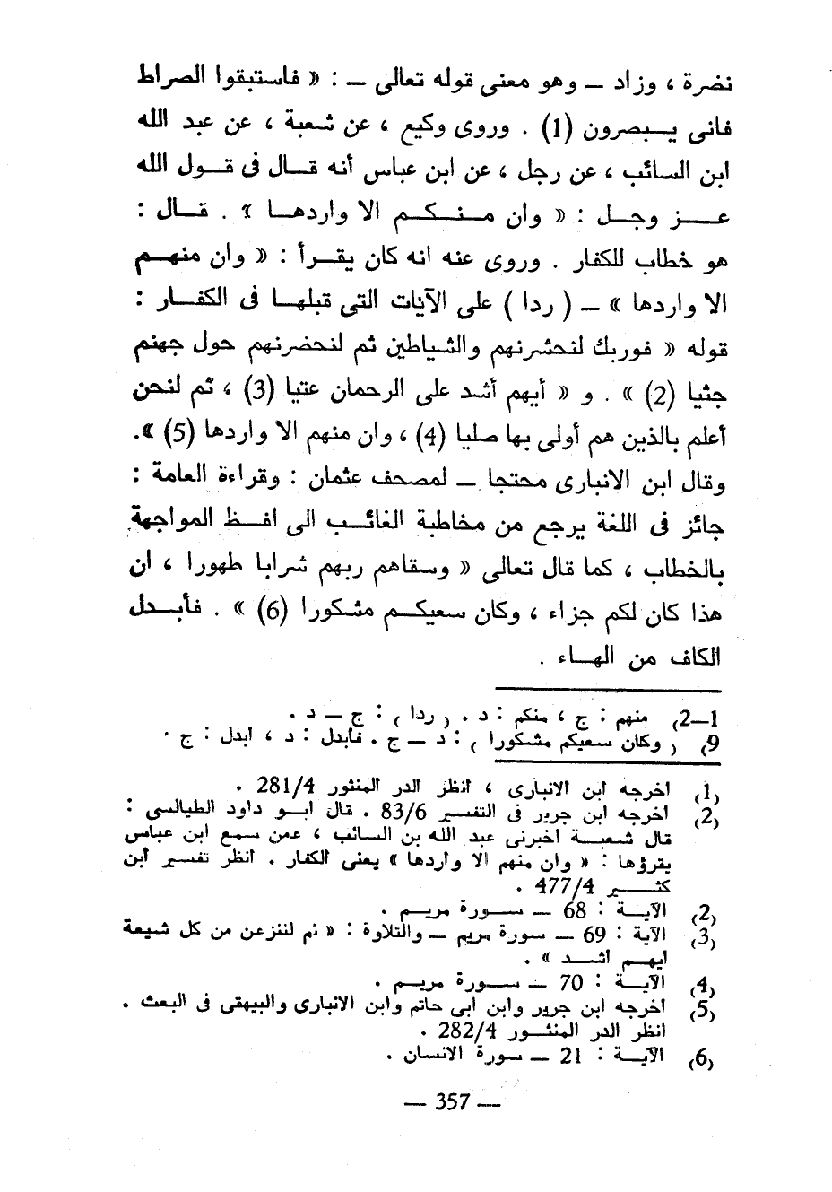 نَضْرَةَ وَزَادَ وَهُوَ مَعْنَى قَوْلِهِ تَعَالَى فَاسْتَبَقُوا الصِّرَاطَ فَأَنَّى يُبْصِرُونَ وَرَوَى وَكِيعٌ عَنْ شُعْبَةَ عَنْ عَبْدِ اللَّهِ بْنِ السَّائِبِ عَنْ رَجُلٍ عَنِ ابْنِ عَبَّاسٍ أَنَّهُ قَالَ فِي قَوْلِ اللَّهِ عَزَّ وَجَلَّ وإن منكم إلا واردها قال هو خطاب لِلْكُفَّارِ وَرُوِيَ عَنْهُ أَنَّهُ كَانَ يَقْرَأُ وَإِنْ مِنْهُمْ إِلَّا وَارِدُهَا (رَدًّا) عَلَى الْآيَاتِ الَّتِي قَبْلَهَا فِي الْكُفَّارِ قَوْلُهُ فَوَرَبِّكَ لَنَحْشُرَنَّهُمْ وَالشَّيَاطِينَ ثُمَّ لَنُحْضِرَنَّهُمْ حَوْلَ جَهَنَّمَ جِثِيًّا وَأَيُّهُمْ أَشَدُّ عَلَى الرَّحْمَنِ عِتِيًّا ثُمَّ لَنَحْنُ أَعْلَمُ بِالَّذِينَ هُمْ أَوْلَى بِهَا صِلِيًّا وَإِنْ مِنْهُمْ إِلَّا واردها وقال ابن الأنباري مُحْتَجًّا لِمُصْحَفِ عُثْمَانَ وَقِرَاءَةُ الْعَامَّةِ جَائِزٌ فِي اللُّغَةِ يَرْجِعُ مِنْ مُخَاطَبَةِ الْغَائِبِ إِلَى لَفْظِ الْمُوَاجَهَةِ بِالْخِطَابِ كَمَا قَالَ تَعَالَى وَسَقَاهُمْ رَبُّهُمْ شَرَابًا طَهُورًا إِنَّ هَذَا كَانَ لَكُمْ جَزَاءً وَكَانَ سَعْيُكُمْ مَشْكُورًا فَأَبْدَلَ الْكَافَ مِنَ الْهَاءِ