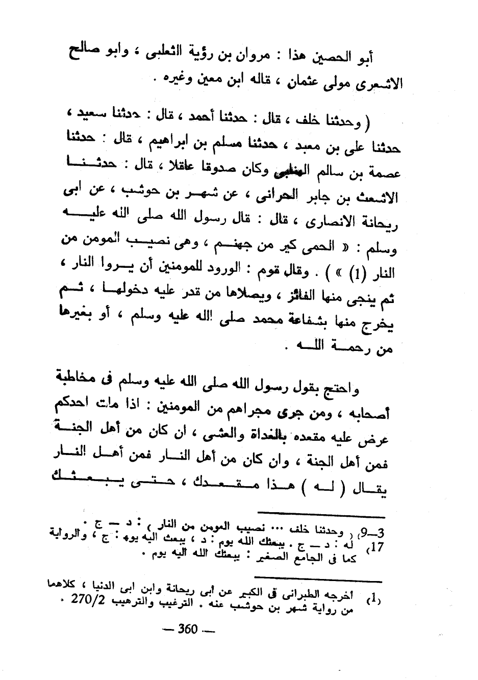 أَبُو الْحُصَيْنِ هَذَا مَرْوَانُ بْنُ رُؤْيَةَ الثَّعْلَبِيُّ وَأَبُو صَالِحٍ الْأَشْعَرِيُّ مَوْلَى عُثْمَانَ قَالَهُ ابْنُ مَعِينٍ وَغَيْرُهُ (وَحَدَّثَنَا خَلَفٌ قَالَ حَدَّثَنَا أَحْمَدُ قَالَ حَدَّثَنَا سَعِيدٌ حَدَّثَنَا عَلِيُّ بْنُ مَعْبَدٍ حَدَّثَنَا مُسْلِمُ بْنُ إِبْرَاهِيمَ قَالَ حَدَّثَنَا عِصْمَةُ بْنُ سَالِمٍ الْهِنَّابِيُّ وَكَانَ صَدُوقًا عَاقِلًا قَالَ حَدَّثَنَا الْأَشْعَثُ بْنُ جَابِرٍ الْحَرَّانِيُّ عَنْ شَهْرِ بْنِ حَوْشَبٍ عَنْ أَبِي رَيْحَانَةَ الْأَنْصَارِيِّ قَالَ قَالَ رَسُولُ اللَّهِ صَلَّى اللَّهُ عَلَيْهِ وَسَلَّمَ ((الحمى كير من جهنم وهي نصيب المؤمن من النار (1)) ) وقال قوم الورود للمؤمنين أَنْ يَرَوُا النَّارَ ثُمَّ يُنَجَّى مِنْهَا الْفَائِزُ وَيَصْلَاهَا مَنْ قُدِّرَ عَلَيْهِ دُخُولُهَا ثُمَّ يَخْرُجُ مِنْهَا بِشَفَاعَةِ مُحَمَّدٍ صَلَّى اللَّهُ عَلَيْهِ وَسَلَّمَ أَوْ بِغَيْرِهَا مِنْ رَحْمَةِ اللَّهِ وَاحْتَجَّ بِقَوْلِ رَسُولِ اللَّهِ صَلَّى اللَّهُ عَلَيْهِ وَسَلَّمَ في مخاطبة أصحابه ومن جرى مجراهم من المؤمنين إِذَا مَاتَ أَحَدُكُمْ عُرِضَ عَلَيْهِ مَقْعَدُهُ بِالْغَدَاةِ وَالْعَشِيِّ إِنْ كَانَ مِنْ أَهْلِ الْجَنَّةِ فَمِنْ أَهْلِ الْجَنَّةِ وَإِنْ كَانَ مِنْ أَهْلِ النَّارِ فَمِنْ أَهْلِ النَّارِ يُقَالُ (لَهُ) هَذَا مَقْعَدُكَ حَتَّى يَبْعَثَكَ