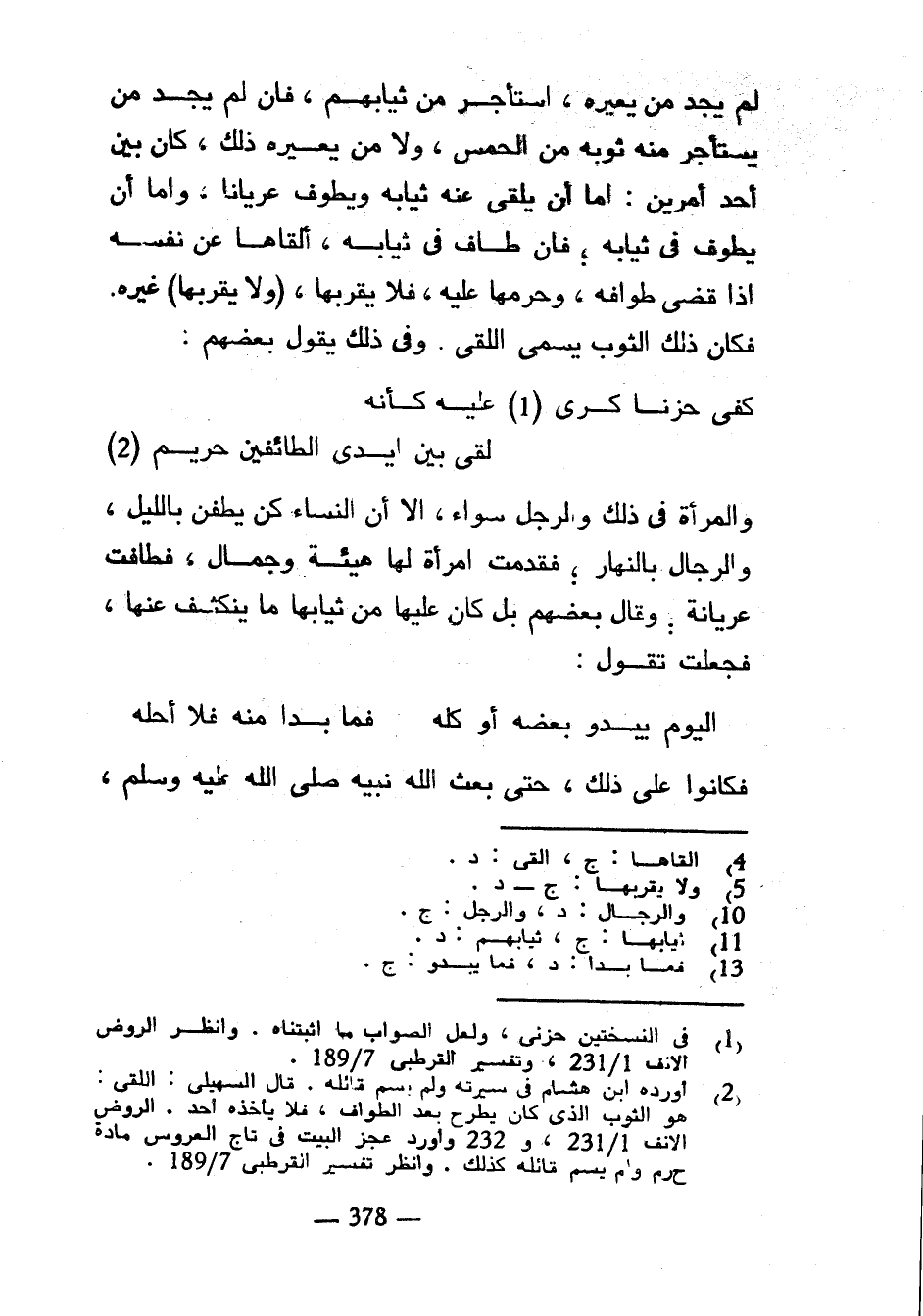 لَمْ يَجِدْ مَنْ يُعِيرُهُ اسْتَأْجَرَ مِنْ ثِيَابِهِمْ فَإِنْ لَمْ يَجِدْ مَنْ يَسْتَأْجِرُ مِنْهُ ثَوْبَهُ مِنُ الْحُمْسِ وَلَا مَنْ يُعِيرُهُ ذَلِكَ كَانَ بَيْنَ أَحَدِ أَمْرَيْنِ إِمَّا أَنْ يُلْقِيَ عَنْهُ ثِيَابَهُ وَيَطُوفَ عُرْيَانًا وَإِمَّا أَنْ يَطُوفَ فِي ثِيَابِهِ فَإِنْ طَافَ فِي ثِيَابِهِ أَلْقَاهَا عَنْ نَفْسِهِ إِذَا قَضَى طَوَافَهُ وَحَرَّمَهَا عَلَيْهِ فَلَا يَقْرَبُهَا (وَلَا يَقْرَبُهَا) غَيْرُهُ فَكَانَ ذَلِكَ الثَّوْبُ يُسَمَّى اللَّقَى وَفِي ذَلِكَ يَقُولُ بَعْضُهُمْ ... كَفَى حُزْنًا كَرِّي عَلَيْهِ كَأَنَّهُ ... لَقًى بَيْنَ أَيْدِي الطَّائِفِينَ حَرِيمُ ... وَالْمَرْأَةُ فِي ذَلِكَ وَالرَّجُلُ سَوَاءٌ إِلَّا أَنَّ النِّسَاءَ كُنَّ يَطُفْنَ بِاللَّيْلِ وَالرِّجَالَ بِالنَّهَارِ فَقَدِمَتِ امْرَأَةٌ لَهَا هَيْئَةٌ وَجَمَالٌ فَطَافَتْ عُرْيَانَةً وَقَالَ بَعْضُهُمْ بَلْ كَانَ عَلَيْهَا مِنْ ثِيَابِهَا مَا يَنْكَشِفُ عَنْهَا فَجَعَلَتْ تَقُولُ ... الْيَوْمَ يَبْدُو بَعْضُهُ أَوْ كُلُّهْ ... فَمَا بَدَا مِنْهُ فَلَا أُحِلُّهْ ... فَكَانُوا عَلَى ذَلِكَ حَتَّى بَعَثَ اللَّهُ نَبِيَّهُ صَلَّى اللَّهُ عَلَيْهِ وَسَلَّمَ