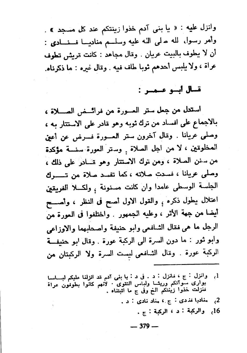 وأنزل عليه يا بني آدَمَ خُذُوا زِينَتَكُمْ عِنْدَ كُلِّ مَسْجِدٍ وَأَمَّرَ رَسُولُ اللَّهِ صَلَّى اللَّهُ عَلَيْهِ وَسَلَّمَ مُنَادِيًا فَنَادَى أَنْ لَا يَطُوفَ بِالْبَيْتِ عُرْيَانٌ وَقَالَ مُجَاهِدٌ كَانَتْ قُرَيْشٌ تَطُوفُ عُرَاةً وَلَا يَلْبَسُ أَحَدُهُمْ ثَوْبًا طَافَ فِيهِ وَقَالَ غَيْرُهُ مَا ذَكَرْنَاهُ قَالَ أَبُو عُمَرَ اسْتَدَلَّ مَنْ جَعَلَ سَتْرَ الْعَوْرَةِ مِنْ فَرَائِضِ الصَّلَاةِ بِالْإِجْمَاعِ عَلَى إِفْسَادِ مَنْ تَرَكَ ثَوْبَهُ وَهُوَ قَادِرٌ عَلَى الْاسْتِتَارِ بِهِ وَصَلَّى عُرْيَانًا وَقَالَ آخَرُونَ سَتْرُ الْعَوْرَةِ فَرْضٌ عَنْ أَعْيُنِ الْمَخْلُوقِينَ لَا مِنْ أَجْلِ الصَّلَاةِ وَسَتْرُ الْعَوْرَةِ سُنَّةٌ مُؤَكَّدَةٌ مِنْ سُنَنِ الصَّلَاةِ وَمَنْ تَرَكَ الْاسْتِتَارَ وَهُوَ قَادِرٌ عَلَى ذَلِكَ وَصَلَّى عُرْيَانًا فَسَدَتْ صَلَاتُهُ كَمَا تَفْسُدُ صَلَاةُ مَنْ تَرَكَ الْجِلْسَةَ الْوُسْطَى عَامِدًا وَإِنْ كَانَتْ مَسْنُونَةً وَلِكِلَا الْفَرِيقَيْنِ اعْتِلَالٌ يَطُولُ ذِكْرُهُ وَالْقَوْلُ الْأَوَّلُ أَصَحُّ فِي النَّظَرِ وَأَصَحُّ أَيْضًا مِنْ جِهَةِ الْأَثَرِ وَعَلَيْهِ الْجُمْهُورُ وَاخْتَلَفُوا فِي الْعَوْرَةِ مِنَ الرَّجُلِ مَا هِيَ فَقَالَ الشَّافِعِيُّ وَأَبُو حَنِيفَةَ وَأَصْحَابُهُمَا وَالْأَوْزَاعِيُّ وَأَبُو ثَوْرٍ مَا دُونُ السُّرَّةِ إِلَى الرُّكْبَةِ عَوْرَةٌ وَقَالَ أَبُو حَنِيفَةَ الرُّكْبَةُ عَوْرَةٌ وَقَالَ الشَّافِعِيُّ لَيْسَتِ السُّرَّةُ وَلَا الرُّكْبَتَانِ مِنَ