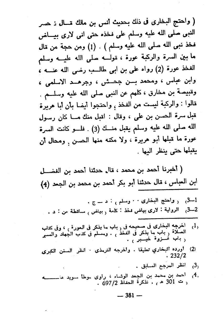 (وَاحْتَجَّ الْبُخَارِيُّ فِي ذَلِكَ بِحَدِيثِ أَنَسِ بْنِ مَالِكٍ قَالَ حَسَرَ النَّبِيُّ صَلَّى اللَّهُ عَلَيْهِ وَسَلَّمَ عَلَى فَخِذِهِ حَتَّى إِنِّي لَأَرَى بَيَاضَ فَخِذِ نَبِيِّ اللَّهِ صَلَّى اللَّهُ عَلَيْهِ وَسَلَّمَ) وَمِنْ حُجَّةِ مَنْ قَالَ مَا بَيْنَ السُّرَّةِ والركبة عروة قَوْلُهُ صَلَّى اللَّهُ عَلَيْهِ وَسَلَّمَ الْفَخِذُ عَوْرَةٌ رَوَاهُ عَلِيُّ بْنُ أَبِي طَالِبٍ رَضِيَ اللَّهُ عَنْهُ وَابْنُ عَبَّاسٍ وَمُحَمَّدُ بْنُ جَحْشٍ وَجَرْهَدٌ الْأَسْلَمِيُّ وَقَبِيصَةُ بْنُ مُخَارِقٍ كُلُّهُمْ عَنِ النَّبِيِّ صَلَّى اللَّهُ عَلَيْهِ وَسَلَّمَ قَالُوا وَالرُّكْبَةُ لَيْسَتْ مِنَ الْفَخِذِ وَاحْتَجُّوا أَيْضًا بِأَنَّ أَبَا هُرَيْرَةَ قَبَّلَ سُرَّةَ الْحَسَنِ بْنِ عَلِيٍّ وَقَالَ أُقَبِّلُ مِنْكَ مَا كَانَ رَسُولُ اللَّهِ صَلَّى اللَّهُ عَلَيْهِ وَسَلَّمَ يُقَبِّلُ مِنْكَ فَلَوْ كَانَتِ السُّرَّةُ عَوْرَةً مَا قَبَّلَهَا أَبُو هُرَيْرَةَ وَلَا مَكَّنَهُ مِنْهَا الْحَسَنُ وَمُحَالٌ أَنْ يُقَبِّلَهَا حَتَّى يَنْظُرَ إِلَيْهَا (أَخْبَرَنَا أَحْمَدُ بْنُ مُحَمَّدٍ قَالَ حَدَّثَنَا أَحْمَدُ بْنُ الْفَضْلِ بْنِ الْعَبَّاسِ قَالَ حَدَّثَنَا أَبُو بَكْرٍ أَحْمَدُ بْنُ مُحَمَّدِ بْنِ الْجَعْدِ (4)