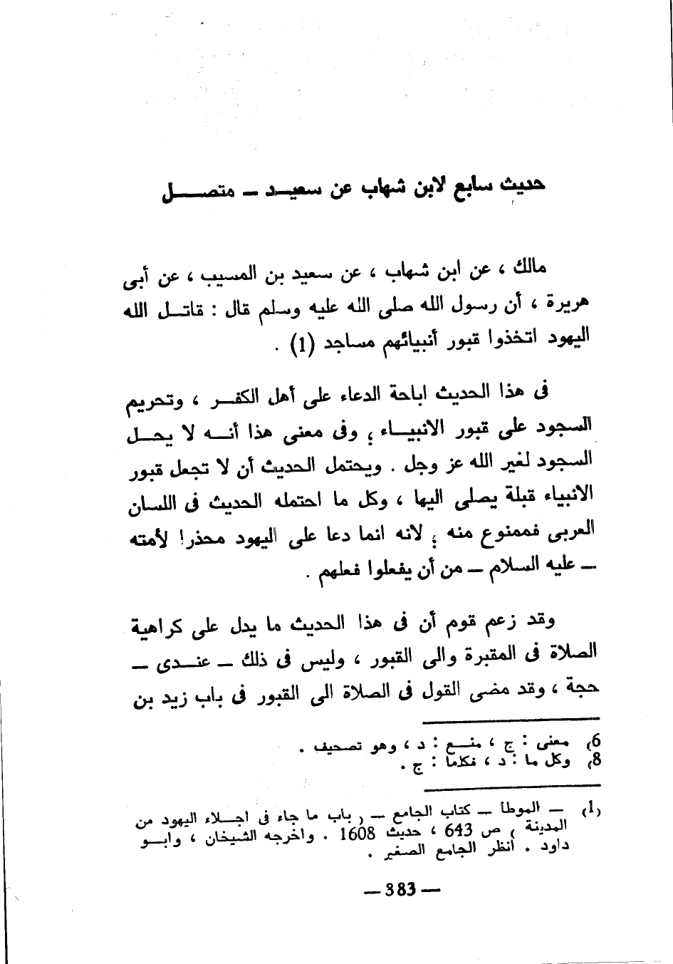 حَدِيثٌ سَابِعٌ لِابْنِ شِهَابٍ عَنْ سَعِيدٍ مُتَّصِلٌ مالك عَنِ ابْنِ شِهَابٍ عَنْ سَعِيدِ بْنِ الْمُسَيَّبِ عَنْ أَبِي هُرَيْرَةَ أَنَّ رَسُولَ اللَّهِ صَلَّى اللَّهُ عَلَيْهِ وَسَلَّمَ قَالَ قَاتَلَ اللَّهُ الْيَهُودَ اتَّخَذُوا قُبُورَ أَنْبِيَائِهِمْ مَسَاجِدَ فِي هَذَا الْحَدِيثِ إِبَاحَةُ الدُّعَاءِ عَلَى أَهْلِ الْكُفْرِ وَتَحْرِيمُ السُّجُودِ عَلَى قُبُورِ الْأَنْبِيَاءِ وَفِي مَعْنَى هَذَا أَنَّهُ لَا يَحِلُّ السُّجُودُ لِغَيْرِ اللَّهِ عَزَّ وَجَلَّ وَيَحْتَمِلُ الْحَدِيثُ أَنْ لَا تُجْعَلَ قُبُورُ الْأَنْبِيَاءِ قِبْلَةً يُصَلَّى إِلَيْهَا وَكُلُّ مَا احْتَمَلَهُ الْحَدِيثُ فِي اللِّسَانِ الْعَرَبِيِّ فَمَمْنُوعٌ مِنْهُ لِأَنَّهُ إِنَّمَا دَعَا عَلَى الْيَهُودِ مُحَذِّرًا لِأُمَّتِهِ عَلَيْهِ السَّلَامُ مِنْ أَنْ يَفْعَلُوا فِعْلَهُمْ وَقَدْ زَعَمَ قَوْمٌ أَنَّ فِي هَذَا الْحَدِيثِ مَا يَدُلُّ عَلَى كَرَاهِيَةِ الصَّلَاةِ فِي الْمَقْبَرَةِ وَإِلَى الْقُبُورِ وَلَيْسَ فِي ذَلِكَ عِنْدِي حُجَّةٌ وَقَدْ مَضَى الْقَوْلُ فِي الصَّلَاةِ إِلَى الْقُبُورِ فِي بَابِ زيد ابن