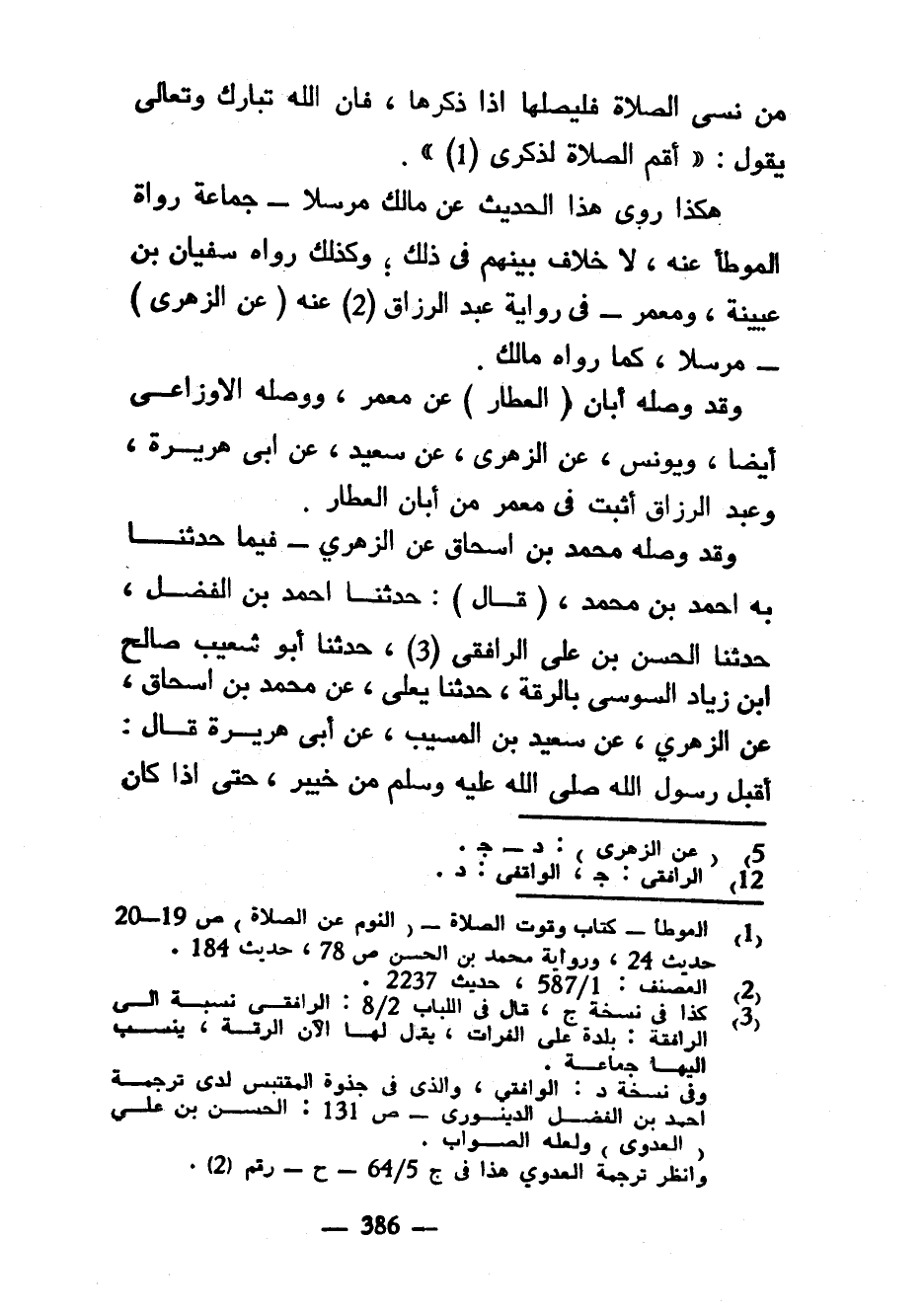 مَنْ نَسِيَ الصَّلَاةَ فَلْيُصَلِّهَا إِذَا ذَكَرَهَا فَإِنَّ اللَّهَ تَبَارَكَ وَتَعَالَى يَقُولُ وَأَقِمِ الصَّلَاةَ لِذِكْرِي هَكَذَا رَوَى هَذَا الْحَدِيثَ عَنْ مَالِكٍ مُرْسَلًا جَمَاعَةُ رُوَاةِ الْمُوَطَّأِ عَنْهُ لَا خِلَافَ بَيْنَهُمْ فِي ذَلِكَ وَكَذَلِكَ رَوَاهُ سُفْيَانُ بْنُ عُيَيْنَةَ وَمَعْمَرٌ فِي رِوَايَةِ عَبْدِ الرَّزَّاقِ عَنْهُ (عَنِ الزُّهْرِيِّ) مُرْسَلًا كَمَا رَوَاهُ مَالِكٌ وَقَدْ وَصَلَهُ أَبَانُ (الْعَطَّارُ) عَنْ مَعْمَرٍ وَوَصَلَهُ الْأَوْزَاعِيُّ أَيْضًا وَيُونُسُ عَنِ الزُّهْرِيِّ عَنْ سَعِيدٍ عَنْ أَبِي هُرَيْرَةَ وَعَبْدُ الرَّزَّاقِ أَثْبَتُ فِي مَعْمَرٍ مِنْ أَبَانَ الْعَطَّارِ وَقَدْ وَصَلَهُ مُحَمَّدُ بْنُ إِسْحَاقَ عَنِ الزُّهْرِيِّ فِيمَا حَدَّثَنَا بِهِ أَحْمَدُ بْنُ مُحَمَّدٍ (قَالَ) حَدَّثَنَا أَحْمَدُ بْنُ الْفَضْلِ حَدَّثَنَا الْحَسَنُ بْنُ عَلِيٍّ الرَّافِقِيُّ حَدَّثَنَا أَبُو شُعَيْبٍ صالح ابن زِيَادٍ السُّوسِيُّ بِالرَّقَّةِ حَدَّثَنَا يَعْلَى عَنْ مُحَمَّدِ بْنِ إِسْحَاقَ عَنِ الزُّهْرِيِّ عَنْ سَعِيدِ بْنِ الْمُسَيَّبِ عَنْ أَبِي هُرَيْرَةَ قَالَ أَقْبَلَ رَسُولُ اللَّهِ صَلَّى اللَّهُ عَلَيْهِ وَسَلَّمَ مِنْ خَيْبَرَ حَتَّى إِذَا كَانَ