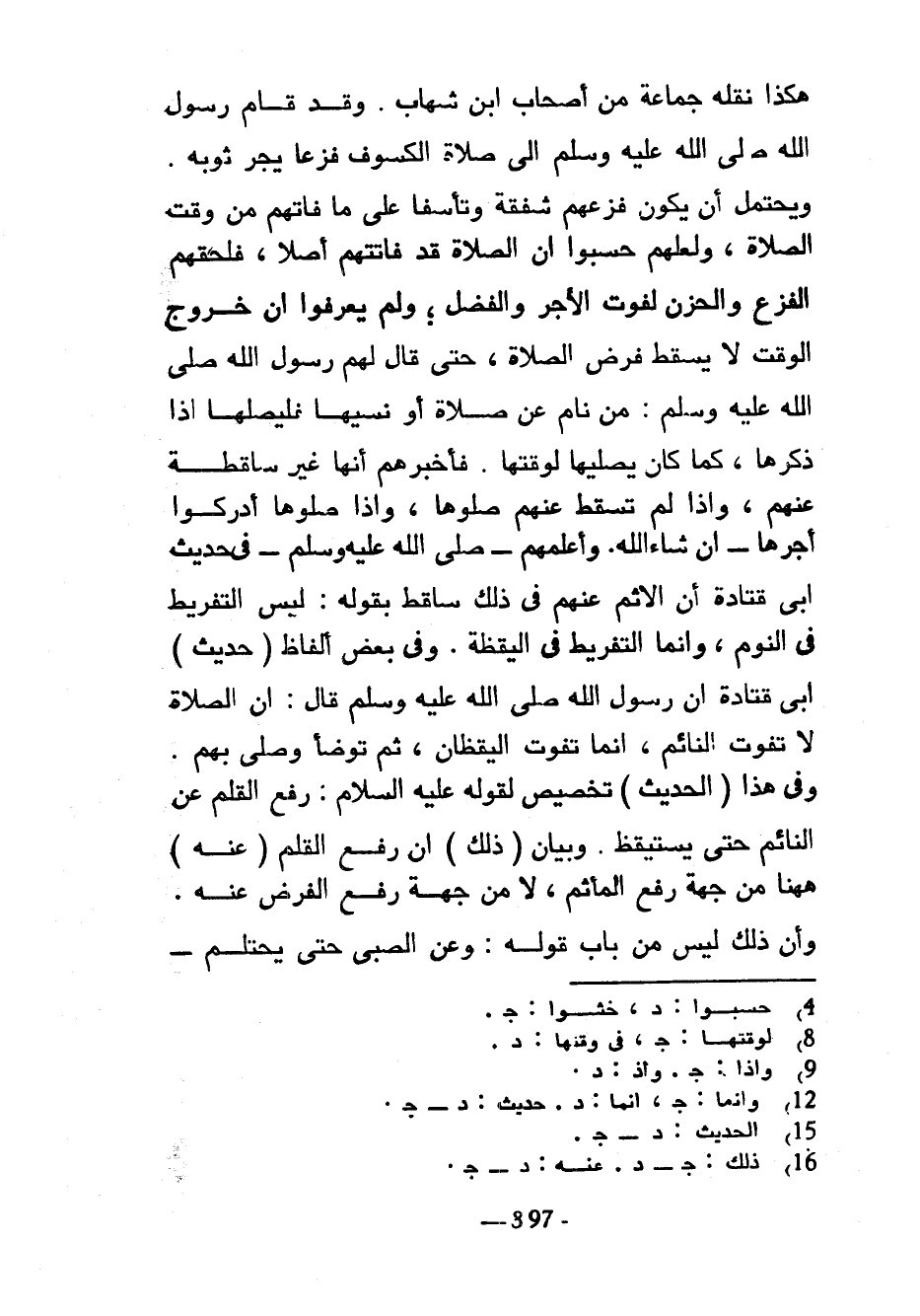 هَكَذَا نَقَلَهُ جَمَاعَةٌ مِنْ أَصْحَابِ ابْنِ شِهَابٍ وَقَدْ قَامَ رَسُولُ اللَّهِ صَلَّى اللَّهُ عَلَيْهِ وَسَلَّمَ إِلَى صَلَاةِ الْكُسُوفِ فَزِعًا يَجُرُّ ثَوْبَهُ وَيَحْتَمِلُ أَنْ يَكُونَ فَزَعُهُمْ شَفَقَةً وَتَأَسُّفًا عَلَى مَا فَاتَهُمْ مِنْ وَقْتِ الصَّلَاةِ وَلَعَلَّهُمْ حَسِبُوا أَنَّ الصَّلَاةَ قَدْ فَاتَتْهُمْ أَصْلًا فَلَحِقَهُمُ الْفَزَعُ وَالْحُزْنُ لِفَوْتِ الْأَجْرِ وَالْفَضْلِ وَلَمْ يَعْرِفُوا أَنَّ خروج الوقت لايسقط فَرْضَ الصَّلَاةِ حَتَّى قَالَ لَهُمْ رَسُولُ اللَّهِ صَلَّى اللَّهُ عَلَيْهِ وَسَلَّمَ مَنْ نَامَ عَنْ صَلَاةٍ أَوْ نَسِيَهَا فَلْيُصَلِّهَا إِذَا ذَكَرَهَا كَمَا كَانَ يُصَلِّيهَا لِوَقْتِهَا فَأَخْبَرَهُمْ أَنَّهَا غَيْرُ سَاقِطَةٍ عَنْهُمْ وَإِذَا لَمْ تَسْقُطْ عَنْهُمْ صَلَّوْهَا وَإِذَا صَلَّوْهَا أَدْرَكُوا أَجْرَهَا إِنْ شَاءَ اللَّهُ وَأَعْلَمَهُمْ صَلَّى اللَّهُ عَلَيْهِ وَسَلَّمَ فِي حَدِيثِ أَبِي قَتَادَةَ أَنَّ الْإِثْمَ عَنْهُمْ فِي ذَلِكَ سَاقِطٌ بِقَوْلِهِ لَيْسَ التَّفْرِيطُ فِي النَّوْمِ وَإِنَّمَا التَّفْرِيطُ فِي الْيَقَظَةِ وَفِي بَعْضِ أَلْفَاظِ (حَدِيثِ) أَبِي قَتَادَةَ أَنَّ رَسُولَ اللَّهِ صَلَّى اللَّهُ عَلَيْهِ وَسَلَّمَ قَالَ إِنَّ الصَّلَاةَ لَا تَفُوتُ النَّائِمَ إِنَّمَا تَفُوتُ الْيَقْظَانَ ثُمَّ تَوَضَّأَ وَصَلَّى بِهِمْ وَفِي هَذَا (الْحَدِيثِ) تَخْصِيصٌ لِقَوْلِهِ عَلَيْهِ السَّلَامُ رُفِعَ الْقَلَمُ عَنِ النَّائِمِ حَتَّى يَسْتَيْقِظَ وَبَيَانُ (ذلك) أن رفع القلم (عنه) ههنا مِنْ جِهَةِ رَفْعِ الْمَأْثَمِ لَا مِنْ جِهَةِ رَفْعِ الْفَرْضِ عَنْهُ وَأَنَّ ذَلِكَ لَيْسَ مِنْ بَابِ قَوْلِهِ وَعَنِ الصَّبِيِّ حَتَّى يَحْتَلِمَ