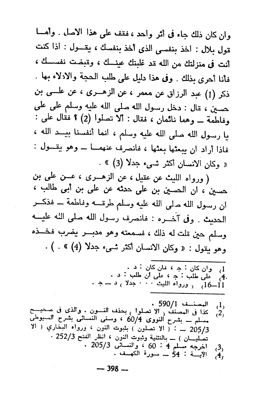 وَإِنْ كَانَ ذَلِكَ جَاءَ فِي أَثَرٍ وَاحِدٍ فَقِفْ عَلَى هَذَا الْأَصْلِ وَأَمَّا قَوْلُ بِلَالٍ أَخَذَ بِنَفْسِي الَّذِي أَخَذَ بِنَفْسِكَ يَقُولُ إِذَا كُنْتَ أَنْتَ فِي مَنْزِلَتِكَ مِنَ اللَّهِ قَدْ غَلَبَتْكَ عَيْنُكَ وَقُبِضَتْ نَفْسُكَ فَأَنَا أَحْرَى بِذَلِكَ وفي هذا دليل على أن طَلَبِ الْحُجَّةِ وَالْإِدْلَاءِ بِهَا ذَكَرَ عَبْدُ الرَّزَّاقِ عَنْ مَعْمَرٍ عَنِ الزُّهْرِيِّ عَنْ عَلِيِّ بْنِ حُسَيْنٍ قَالَ دَخَلَ رَسُولُ اللَّهِ صَلَّى اللَّهُ عَلَيْهِ وَسَلَّمَ عَلَى عَلِيٍّ وَفَاطِمَةَ وَهُمَا نَائِمَانِ فَقَالَ أَلَا تُصَلُّوا فَقَالَ عَلِيٌّ يَا رَسُولَ اللَّهِ صَلَّى اللَّهُ عَلَيْهِ وَسَلَّمَ إِنَّمَا أَنْفُسُنَا بِيَدِ اللَّهِ فَإِذَا أَرَادَ أَنْ يَبْعَثَهَا بَعَثَهَا فَانْصَرَفَ عَنْهُمَا وَهُوَ يَقُولُ وَكَانَ الْإِنْسَانُ أَكْثَرَ شَيْءٍ جَدَلًا (وَرَوَاهُ اللَّيْثُ عَنْ عُقَيْلٍ عَنِ الزُّهْرِيِّ عَنْ عَلِيِّ بْنِ حُسَيْنٍ أَنَّ الْحُسَيْنَ بْنَ عَلِيٍّ حَدَّثَهُ عَنْ عَلِيِّ بْنِ أَبِي طَالِبٍ أَنَّ رَسُولَ اللَّهِ صَلَّى اللَّهُ عَلَيْهِ وَسَلَّمَ طَرَقَهُ وَفَاطِمَةَ فَذَكَرَ الْحَدِيثَ وَفِي آخِرِهِ فَانْصَرَفَ رَسُولُ اللَّهِ صَلَّى اللَّهُ عَلَيْهِ وَسَلَّمَ حِينَ قُلْتُ لَهُ ذَلِكَ فَسَمِعْتُهُ وَهُوَ مُدْبِرٌ يَضْرِبُ فَخِذَهُ وَهُوَ يَقُولُ وَكَانَ الْإِنْسَانُ أَكْثَرَ شيء جدلا)