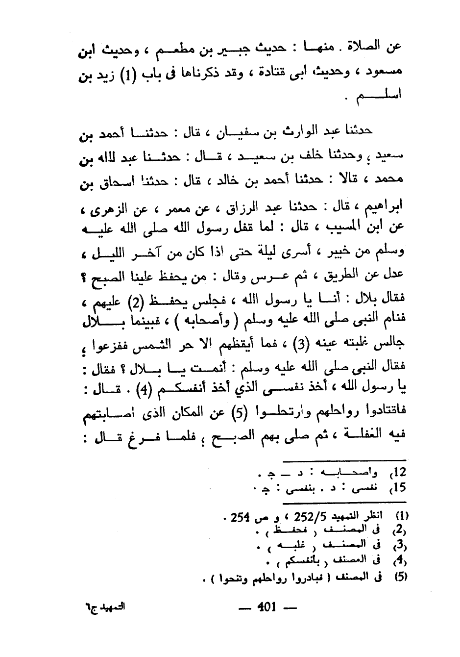 عن الصلاة منها حديث جبير بن مطعن وَحَدِيثُ ابْنِ مَسْعُودٍ وَحَدِيثُ أَبِي قَتَادَةَ وَقَدْ ذَكَرْنَاهَا فِي بَابِ زَيْدِ بْنِ أَسْلَمَ حَدَّثَنَا عَبْدُ الْوَارِثِ بْنُ سُفْيَانَ قَالَ حَدَّثَنَا أَحْمَدُ بْنُ سَعِيدٍ وَحَدَّثَنَا خَلَفُ بْنُ سَعِيدٍ قَالَ حَدَّثَنَا عَبْدُ اللَّهِ بْنُ مُحَمَّدٍ قَالَا حَدَّثَنَا أَحْمَدُ بْنُ خَالِدٍ قَالَ حَدَّثَنَا إِسْحَاقُ بْنُ إِبْرَاهِيمَ قَالَ حَدَّثَنَا عَبْدُ الرَّزَّاقِ عَنْ مَعْمَرٍ عَنِ الزُّهْرِيِّ عَنِ ابْنِ الْمُسَيَّبِ قَالَ لَمَّا قَفَلَ رَسُولُ اللَّهِ صَلَّى اللَّهُ عَلَيْهِ وَسَلَّمَ مِنْ خَيْبَرَ أَسْرَى لَيْلَةً حَتَّى إِذَا كَانَ مِنْ آخِرِ اللَّيْلِ عَدَلَ عَنِ الطَّرِيقِ ثُمَّ عَرَّسَ وَقَالَ مَنْ يَحْفَظُ عَلَيْنَا الصُّبْحَ فَقَالَ بِلَالٌ أَنَا يَا رَسُولَ اللَّهِ فَجَلَسَ يَحْفَظُ عَلَيْهِمْ فَنَامَ النَّبِيُّ صَلَّى اللَّهُ عَلَيْهِ وَسَلَّمَ (وَأَصْحَابُهُ) فَبَيْنَمَا بِلَالٌ جَالِسٌ غَلَبَتْهُ عَيْنُهُ فَمَا أَيْقَظَهُمْ إِلَّا حَرُّ الشَّمْسِ فَفَزِعُوا فَقَالَ النَّبِيُّ صَلَّى اللَّهُ عَلَيْهِ وَسَلَّمَ أَنِمْتَ يَا بِلَالُ فَقَالَ يَا رَسُولَ اللَّهِ أَخَذَ نَفْسِي الَّذِي أخذ نفسكم قَالَ فَاقْتَادُوا رَوَاحِلَهُمْ وَارْتَحَلُوا عَنِ الْمَكَانِ الَّذِي أَصَابَتْهُمْ فِيهِ الْغَفْلَةُ ثُمَّ صَلَّى بِهِمُ الصُّبْحَ فَلَمَّا فَرَغَ قَالَ