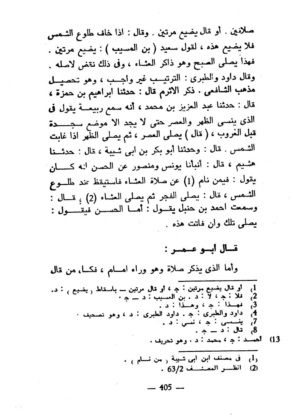 صَلَاتَيْنِ أَوْ قَالَ يُضَيِّعُ مَرَّتَيْنِ وَقَالَ إِذَا خَافَ طُلُوعَ الشَّمْسِ فَلَا يُضَيِّعُ هَذِهِ لِقَوْلِ سَعِيدِ (بْنِ الْمُسَيَّبِ) يُضَيِّعُ مَرَّتَيْنِ فَهَذَا يُصَلِّي الصُّبْحَ وَهُوَ ذَاكِرٌ الْعِشَاءَ وَفِي ذَلِكَ نَقْضٌ لِأَصْلِهِ وَقَالَ دَاوُدُ وَالطَّبَرِيُّ التَّرْتِيبُ غَيْرُ وَاجِبٍ وَهُوَ تَحْصِيلُ مَذْهَبِ الشَّافِعِيِّ ذَكَرَ الْأَثْرَمُ قَالَ حَدَّثَنَا إِبْرَاهِيمُ بْنُ حَمْزَةَ قَالَ حَدَّثَنَا عَبْدُ الْعَزِيزِ بْنُ مُحَمَّدٍ أَنَّهُ سَمِعَ رَبِيعَةَ يَقُولُ فِي الَّذِي يَنْسَى الظُّهْرَ وَالْعَصْرَ حَتَّى لَا يَجِدَ إِلَّا مَوْضِعَ سَجْدَةٍ قَبْلَ الْغُرُوبِ (قَالَ) يُصَلِّي الْعَصْرَ ثُمَّ يُصَلِّي الظُّهْرَ إِذَا غَابَتِ الشَّمْسُ قَالَ وَحَدَّثَنَا أَبُو بَكْرِ بْنُ أَبِي شَيْبَةَ قَالَ حَدَّثَنَا هُشَيْمٌ قَالَ أَنْبَأَنَا يُونُسُ وَمَنْصُورٌ عَنِ الْحَسَنِ أَنَّهُ كَانَ يَقُولُ فِيمَنْ نَامَ عَنْ صَلَاةِ الْعِشَاءِ فَاسْتَيْقَظَ عِنْدَ طُلُوعِ الشَّمْسِ قَالَ يُصَلِّي الْفَجْرَ ثُمَّ يُصَلِّي الْعِشَاءَ قَالَ وَسَمِعْتُ أَحْمَدَ بْنَ حَنْبَلٍ يَقُولُ أَمَّا الْحَسَنُ فَيَقُولُ يُصَلِّي تِلْكَ وَإِنْ فَاتَتْ هَذِهِ قَالَ أَبُو عُمَرَ وَأَمَّا الَّذِي يَذْكُرُ صَلَاةً وَهُوَ وَرَاءَ إِمَامٍ فَكُلُّ مَنْ قَالَ