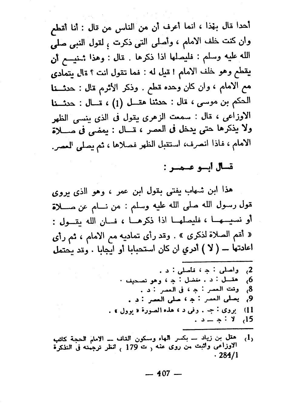أَحَدًا قَالَ بِهَذَا إِنَّمَا أَعْرِفُ أَنَّ مِنَ النَّاسِ مَنْ قَالَ أَنَا أَقْطَعُ وَإِنْ كُنْتُ خَلْفَ الْإِمَامِ وَأُصَلِّي الَّتِي ذَكَرْتُ لِقَوْلِ النَّبِيِّ صَلَّى اللَّهُ عَلَيْهِ وَسَلَّمَ فَلْيُصَلِّهَا إِذَا ذَكَرَهَا قَالَ وَهَذَا شَنِيعٌ أَنْ يَقْطَعَ وَهُوَ خَلْفَ الْإِمَامِ قِيلَ لَهُ فَمَا تَقُولُ أَنْتَ قَالَ يَتَمَادَى مَعَ الْإِمَامِ وَإِنْ كَانَ وَحْدَهُ قَطَعَ وَذَكَرَ الْأَثْرَمُ قَالَ حَدَّثَنَا الْحَكَمُ بْنُ مُوسَى قَالَ حَدَّثَنَا هِقْلٌ قَالَ حَدَّثَنَا الْأَوْزَاعِيُّ قَالَ سَمِعْتُ الزُّهْرِيَّ يَقُولُ فِي الَّذِي يَنْسَى الظُّهْرَ وَلَا يَذْكُرُهَا حَتَّى يَدْخُلَ فِي الْعَصْرِ قَالَ يَمْضِي فِي صَلَاةِ الْإِمَامِ فَإِذَا انْصَرَفَ اسْتَقْبَلَ الظُّهْرَ فَصَلَّاهَا ثُمَّ يُصَلِّي الْعَصْرَ قَالَ أَبُو عُمَرَ هَذَا ابْنُ شِهَابٍ يُفْتِي بِقَوْلِ ابْنِ عُمَرَ وَهُوَ الَّذِي يَرْوِي قَوْلَ رَسُولِ اللَّهِ صلى الله عليه وسلم مَنْ نَامَ عَنْ صَلَاةٍ أَوْ نَسِيَهَا فَلْيُصَلِّهَا إِذَا ذَكَرَهَا فَإِنَّ اللَّهَ يَقُولُ وَأَقِمِ الصَّلَاةَ لِذِكْرِي وَقَدْ رَأَى تَمَادِيَهُ مَعَ الْإِمَامِ ثُمَّ رَأَى إِعَادَتَهَا (لَا) أَدْرِي إِنْ كَانَ اسْتِحْبَابًا أَوْ إِيجَابًا وَقَدْ يحتمل