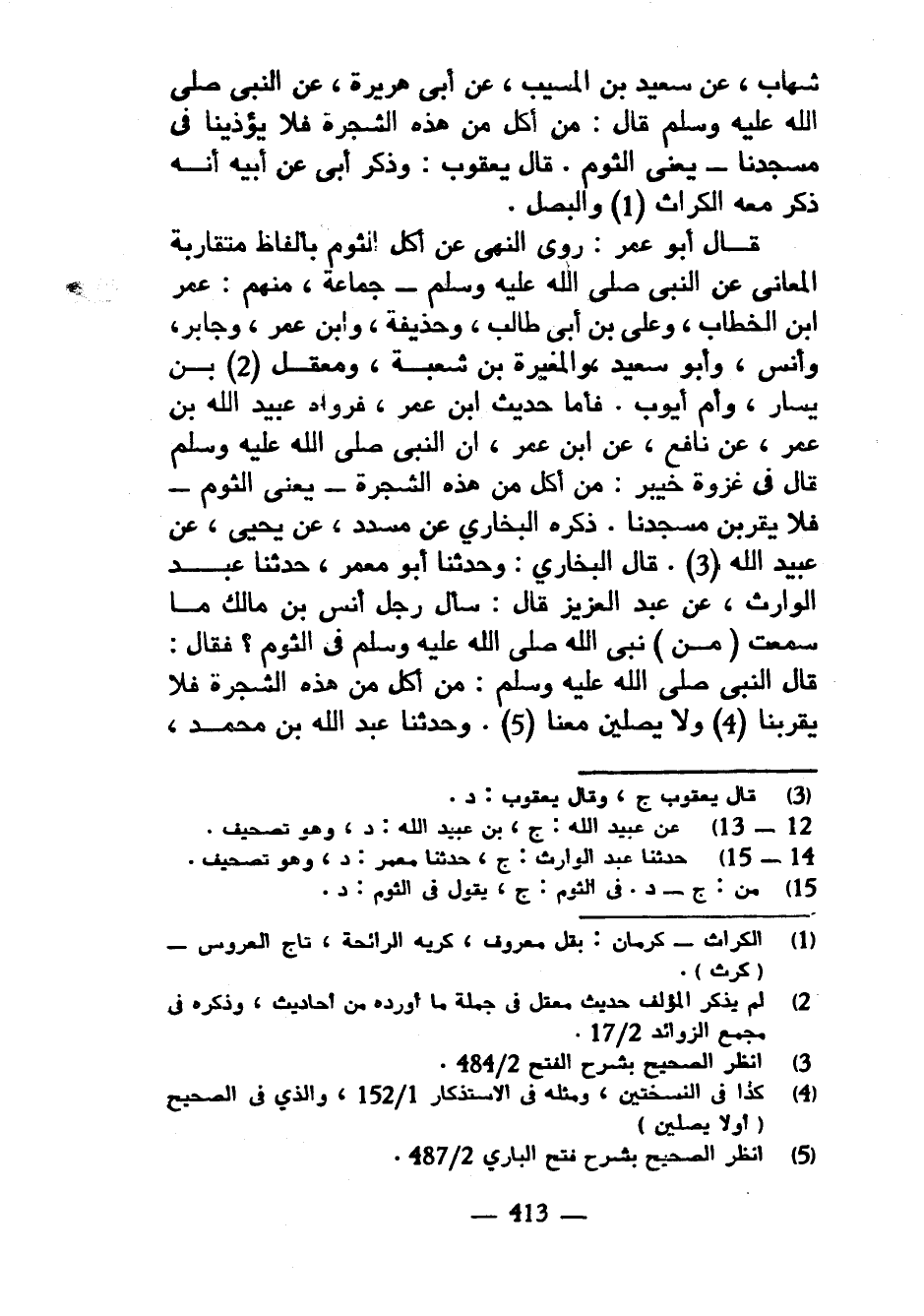 شِهَابٍ عَنْ سَعِيدِ بْنِ الْمُسَيَّبِ عَنْ أَبِي هُرَيْرَةَ عَنِ النَّبِيِّ صَلَّى اللَّهُ عَلَيْهِ وَسَلَّمَ قَالَ مَنْ أَكَلَ مِنْ هَذِهِ الشَّجَرَةِ فَلَا يُؤْذِينَا فِي مَسْجِدِنَا يَعْنِي الثُّومَ قَالَ يَعْقُوبُ وَذَكَرَ أَبِي عَنْ أَبِيهِ أَنَّهُ ذَكَرَ مَعَهُ الْكُرَّاثَ وَالْبَصَلَ قَالَ أَبُو عُمَرَ رَوَى النَّهْيَ عَنْ أَكْلِ الثُّومِ بِأَلْفَاظٍ مُتَقَارِبَةِ الْمَعَانِي عَنِ النَّبِيِّ صَلَّى اللَّهُ عَلَيْهِ وَسَلَّمَ جَمَاعَةٌ مِنْهُمْ عُمَرَ بْنِ الْخَطَّابِ وَعَلِيِّ بْنِ أَبِي طَالِبٍ وَحُذَيْفَةُ وَابْنُ عُمَرَ وَجَابِرٌ وَأَنَسٌ وَأَبُو سَعِيدٍ وَالْمُغِيرَةُ بْنُ شُعْبَةَ وَمَعْقِلُ بْنُ يَسَارٍ وَأُمُّ أَيُّوبَ فَأَمَّا حَدِيثُ ابْنِ عُمَرَ فَرَوَاهُ عُبَيْدُ الله بن عمر عن نافع عن ابْنِ عُمَرَ أَنَّ النَّبِيَّ صَلَّى اللَّهُ عَلَيْهِ وسلم قَالَ فِي غَزْوَةِ خَيْبَرَ مَنْ أَكَلَ مِنْ هَذِهِ الشَّجَرَةِ يَعْنِي الثُّومَ فَلَا يَقْرَبَنَّ مَسْجِدَنَا ذَكَرَهُ الْبُخَارِيُّ عَنْ مُسَدَّدٍ عَنْ يَحْيَى عَنْ عُبَيْدِ اللَّهِ قَالَ الْبُخَارِيُّ وَحَدَّثَنَا أَبُو مَعْمَرٍ حَدَّثَنَا عَبْدُ الْوَارِثِ عَنْ عَبْدِ الْعَزِيزِ قَالَ سَأَلَ رَجُلٌ أَنَسَ بْنَ مَالِكٍ مَا سَمِعْتَ (مِنْ) نَبِيِّ اللَّهِ صَلَّى اللَّهُ عَلَيْهِ وَسَلَّمَ فِي الثُّومِ فَقَالَ قَالَ النَّبِيُّ صَلَّى اللَّهُ عَلَيْهِ وَسَلَّمَ مَنْ أَكَلَ مِنْ هَذِهِ الشَّجَرَةِ فَلَا يَقْرَبَنَّا وَلَا يُصَلِّيَنَّ مَعَنَا وَحَدَّثَنَا عَبْدُ اللَّهِ بْنُ مُحَمَّدٍ