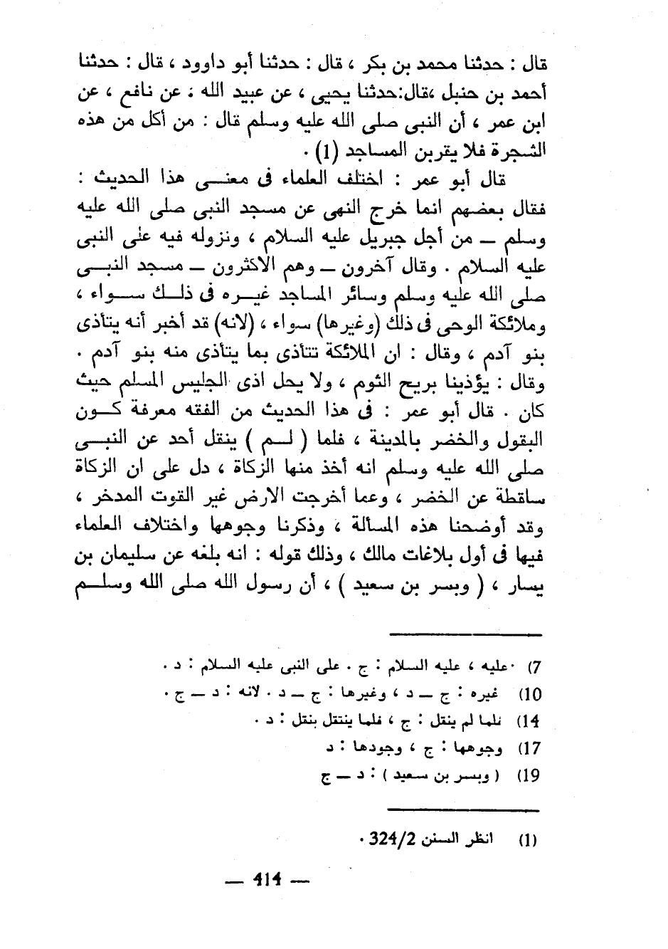 قَالَ حَدَّثَنَا مُحَمَّدُ بْنُ بَكْرٍ قَالَ حَدَّثَنَا أَبُو دَاوُدَ قَالَ حَدَّثَنَا أَحْمَدُ بْنُ حَنْبَلٍ قَالَ حَدَّثَنَا يَحْيَى عَنْ عُبَيْدُ اللَّهِ عَنْ نَافِعٍ عَنِ ابْنِ عُمَرَ أَنَّ النَّبِيَّ صَلَّى اللَّهُ عَلَيْهِ وَسَلَّمَ قَالَ مَنْ أَكَلَ مِنْ هَذِهِ الشَّجَرَةِ فَلَا يَقْرَبَنَّ الْمَسَاجِدَ قَالَ أَبُو عُمَرَ اخْتَلَفَ الْعُلَمَاءُ فِي مَعْنَى هَذَا الْحَدِيثِ فَقَالَ بَعْضُهُمْ إِنَّمَا خَرَجَ النَّهْيُ عَنْ مَسْجِدِ النَّبِيِّ صَلَّى اللَّهُ عَلَيْهِ وَسَلَّمَ مِنْ أجل جِبْرِيلَ عَلَيْهِ السَّلَامُ وَنُزُولِهِ فِيهِ عَلَى النَّبِيِّ عَلَيْهِ السَّلَامُ وَقَالَ آخَرُونَ وَهُمُ الْأَكْثَرُونَ مَسْجِدُ النَّبِيِّ صَلَّى اللَّهُ عَلَيْهِ وَسَلَّمَ وَسَائِرُ الْمَسَاجِدِ غَيْرُهُ فِي ذَلِكَ سَوَاءٌ وَمَلَائِكَةُ الْوَحْيِ فِي ذَلِكَ (وَغَيْرِهَا) سَوَاءٌ (لِأَنَّهُ) قَدْ أَخْبَرَ أَنَّهُ يَتَأَذَّى بَنُو آدَمَ وَقَالَ إِنَّ الْمَلَائِكَةَ تَتَأَذَّى بِمَا يَتَأَذَّى مِنْهُ بَنُو آدَمَ وَقَالَ يُؤْذِينَا بِرِيحِ الثُّومِ وَلَا يَحِلُّ أَذَى الْجَلِيسِ الْمُسْلِمِ حَيْثُ كَانَ قَالَ أَبُو عُمَرَ فِي هَذَا الْحَدِيثِ مِنَ الْفِقْهِ مَعْرِفَةُ كَوْنِ الْبُقُولِ وَالْخُضَرِ بِالْمَدِينَةِ فَلَمَّا (لَمْ) يَنْقُلْ أَحَدٌ عَنِ النَّبِيِّ صَلَّى اللَّهُ عَلَيْهِ وَسَلَّمَ أَنَّهُ أَخَذَ مِنْهَا الزَّكَاةَ دَلَّ عَلَى أَنَّ الزَّكَاةَ سَاقِطَةٌ عَنِ الْخُضَرِ وَعَمَّا أَخْرَجَتِ الْأَرْضُ غَيْرَ الْقُوتِ الْمُدَّخَرِ وَقَدْ أَوْضَحْنَا هَذِهِ الْمَسْأَلَةَ وَذَكَرْنَا وُجُوهَهَا وَاخْتِلَافَ الْعُلَمَاءِ فِيهَا فِي أَوَّلِ بَلَاغَاتِ مَالِكٍ وَذَلِكَ قَوْلُهُ إِنَّهُ بَلَغَهُ عَنْ سُلَيْمَانَ بْنِ يَسَارٍ (وَبُسْرِ بْنِ سَعِيدٍ) أَنَّ رَسُولَ اللَّهِ صَلَّى اللَّهُ عَلَيْهِ وَسَلَّمَ