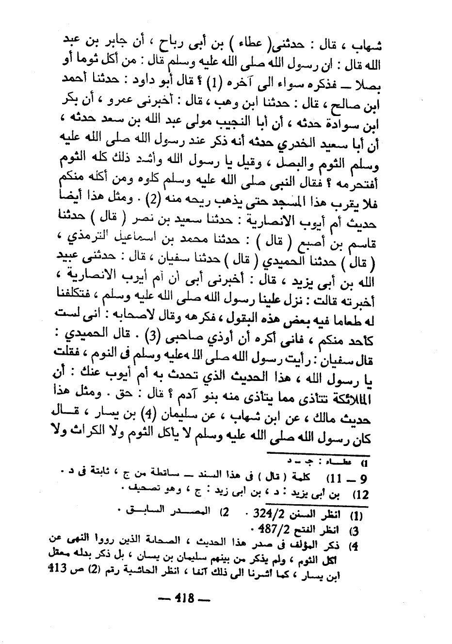 شِهَابٍ قَالَ حَدَّثَنِي (عَطَاءُ) بْنُ أَبِي رَبَاحٍ أَنَّ جَابِرَ بْنَ عَبْدِ اللَّهِ قَالَ إِنَّ رَسُولَ اللَّهِ صَلَّى اللَّهُ عَلَيْهِ وسلم قال مَنْ أَكَلَ ثُومًا أَوْ بَصَلًا فَذَكَرَهُ سَوَاءً إِلَى آخِرِهِ قَالَ أَبُو دَاوُدَ حَدَّثَنَا أَحْمَدُ بْنُ صَالِحٍ قَالَ حَدَّثَنَا ابْنُ وَهْبٍ قَالَ أَخْبَرَنِي عَمْرٌو أَنَّ بَكْرَ بْنَ سَوَادَةَ حَدَّثَهُ أَنَّ أَبَا النَّجِيبِ مَوْلَى عَبْدِ اللَّهِ بْنِ سَعْدٍ حَدَّثَهُ أَنَّ أَبَا سَعِيدٍ الْخُدْرِيِّ حَدَّثَهُ أَنَّهُ ذُكِرَ عِنْدَ رَسُولِ اللَّهِ صَلَّى اللَّهُ عَلَيْهِ وَسَلَّمَ الثُّومُ وَالْبَصَلُ وَقِيلَ يَا رَسُولَ اللَّهِ وَأَشَدُّ ذَلِكَ كُلِّهِ الثُّومُ أَفَتُحَرِّمُهُ فَقَالَ النَّبِيُّ صَلَّى اللَّهُ عَلَيْهِ وَسَلَّمَ كُلُوهُ وَمَنْ أكله منكم فلا يقرب هذاالمسجد حَتَّى يَذْهَبَ رِيحُهُ مِنْهُ وَمِثْلُ هَذَا أَيْضًا حَدِيثُ أُمِّ أَيُّوبَ الْأَنْصَارِيَّةِ حَدَّثَنَا سَعِيدُ بْنُ نَصْرٍ (قَالَ) حَدَّثَنَا قَاسِمُ بْنُ أَصْبَغَ (قَالَ) حَدَّثَنَا مُحَمَّدُ بْنُ إِسْمَاعِيلَ التِّرْمِذِيُّ (قَالَ) حَدَّثَنَا الْحُمَيْدِيُّ (قَالَ) حَدَّثَنَا سُفْيَانُ قَالَ حَدَّثَنِي عُبَيْدُ اللَّهِ بْنُ أَبِي يَزِيدَ قَالَ أَخْبَرَنِي أَبِي أَنَّ أُمَّ أَيُّوبَ الْأَنْصَارِيَّةَ أَخْبَرَتْهُ قَالَتْ نَزَلَ عَلَيْنَا رَسُولُ اللَّهِ صَلَّى اللَّهُ عَلَيْهِ وَسَلَّمَ فَتَكَلَّفْنَا لَهُ طَعَامًا فِيهِ بَعْضُ هَذِهِ الْبُقُولِ فَكَرِهَهُ وَقَالَ لِأَصْحَابِهِ إِنِّي لَسْتُ كَأَحَدٍ مِنْكُمْ فإني أكره أن أوذي صاحبي قال الحميدي قَالَ سُفْيَانُ رَأَيْتُ رَسُولَ اللَّهِ صَلَّى اللَّهُ عَلَيْهِ وَسَلَّمَ فِي النَّوْمِ فَقُلْتُ يَا رَسُولَ اللَّهِ هَذَا الْحَدِيثُ الَّذِي تُحَدِّثُ بِهِ أُمُّ أَيُّوبَ عَنْكَ أَنَّ الْمَلَائِكَةَ تَتَأَذَّى مِمَّا يَتَأَذَّى مِنْهُ بَنُو آدَمَ قَالَ حَقٌّ وَمِثْلُ هَذَا حَدِيثِ مَالِكٍ عَنِ ابْنِ شِهَابٍ عَنْ سُلَيْمَانَ بْنِ يَسَارٍ قَالَ كَانَ رَسُولُ اللَّهِ صَلَّى اللَّهُ عَلَيْهِ وَسَلَّمَ لَا يَأْكُلُ الثُّومَ وَلَا الكراث ولا